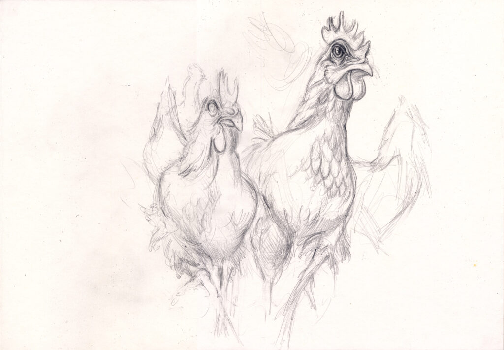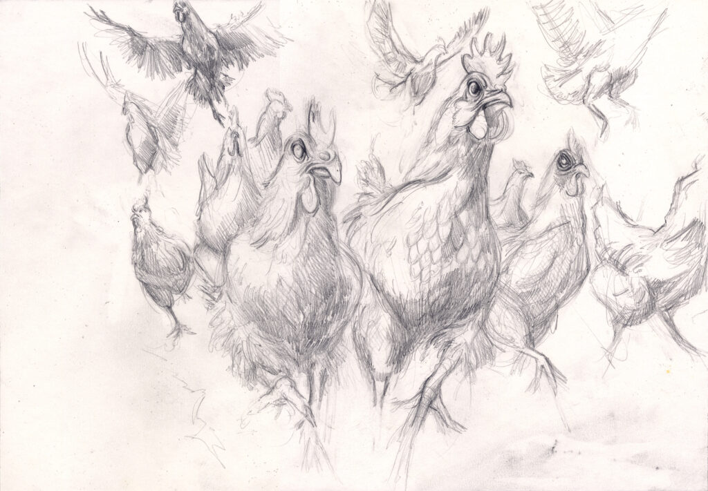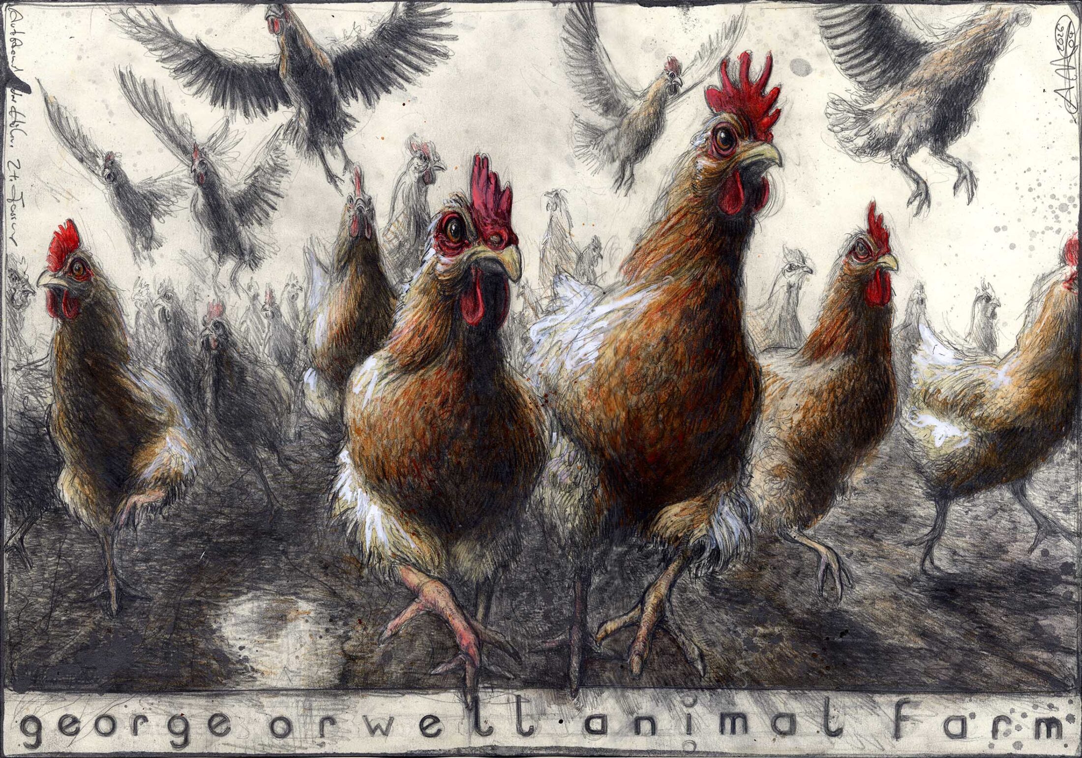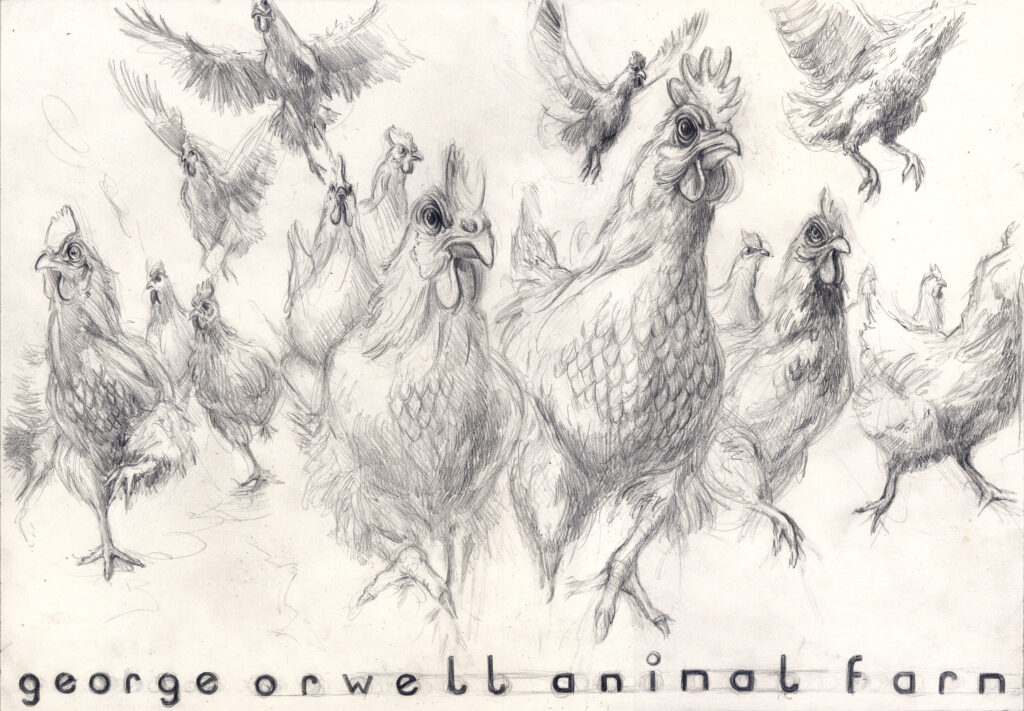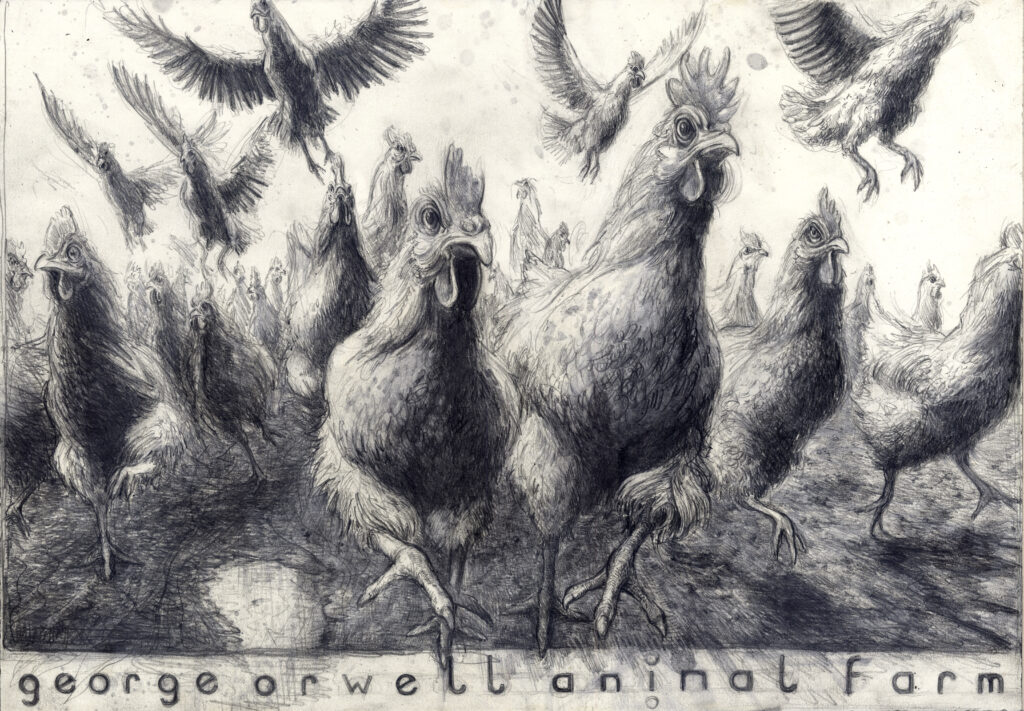 In beiden Fällen bleibt der Bezug zu Orwell spürbar, doch deine Arbeiten lösen sich zugleich von der literarischen Vorlage und öffnen einen eigenen Raum. Der Aufstand der Hühner wird nicht nur als Episode eines politischen Gleichnisses sichtbar, sondern als universelles Bild für die fragile Grenze zwischen Ohnmacht und Handlung, zwischen Erkenntnis und Aufbruch.