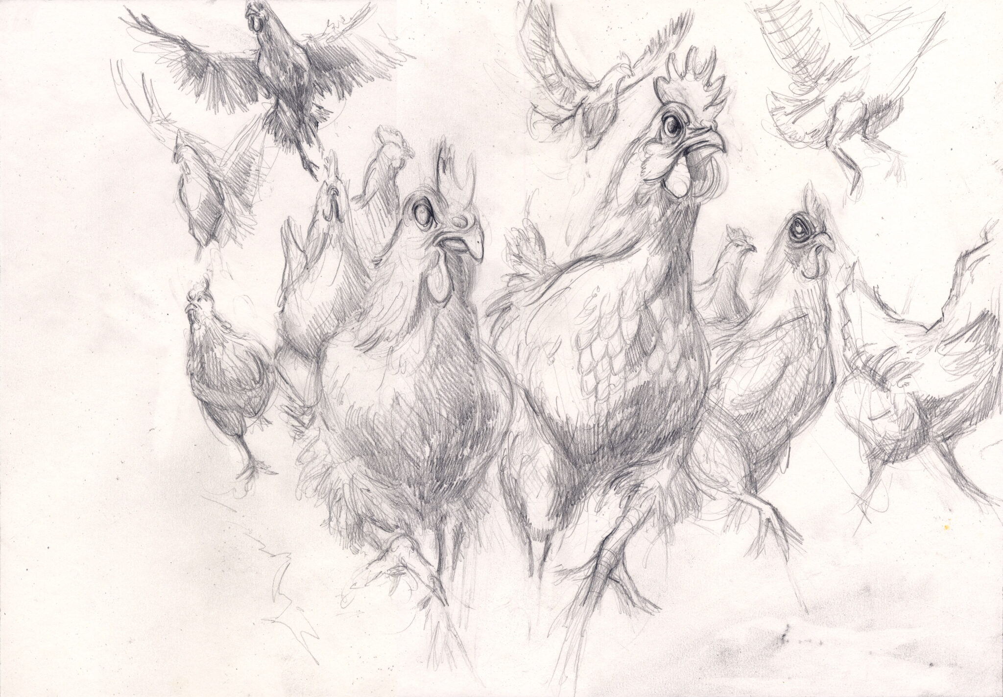 Die zweite Fassung zu diesem Thema verschiebt die Perspektive radikal. Hier wird der Aufstand körperlich, eruptiv, beinahe ungestüm. Die Hühner sind nicht länger Symbole eines inneren Bruchs, sondern Akteure eines äußeren Geschehens. Bewegung dominiert das Bild: Flügelschläge, Krallen, ein kollektives Vorwärtsdrängen. Die Rebellion ist nicht mehr Idee, sondern Handlung. Während die erste Fassung die Tragik des Opfers betont, zeigt die zweite die Energie des Schwarms. Die Hühner wirken weniger wie Märtyrer und mehr wie eine Naturkraft, die sich Bahn bricht — unkoordiniert vielleicht, aber voller Dringlichkeit.