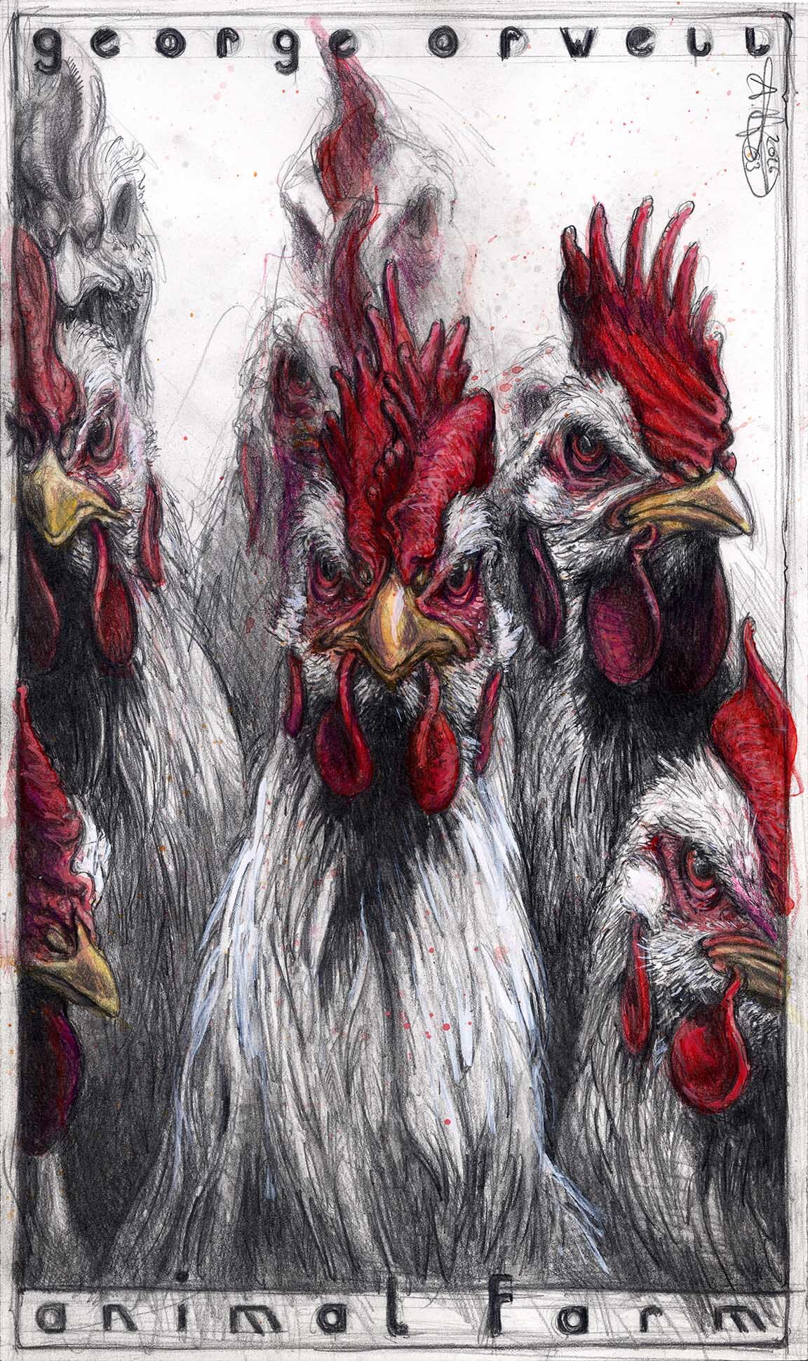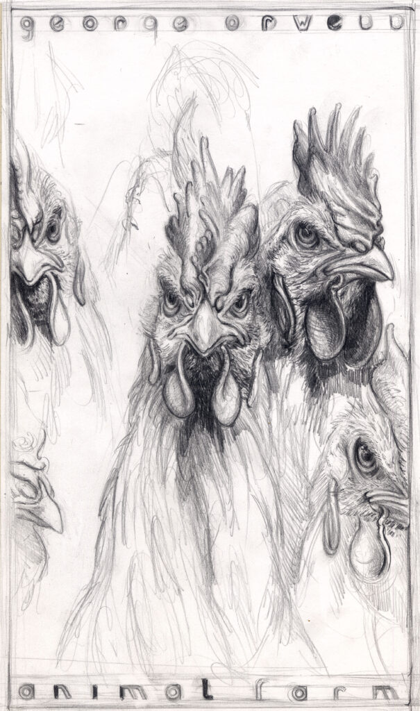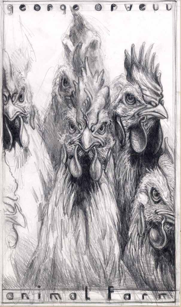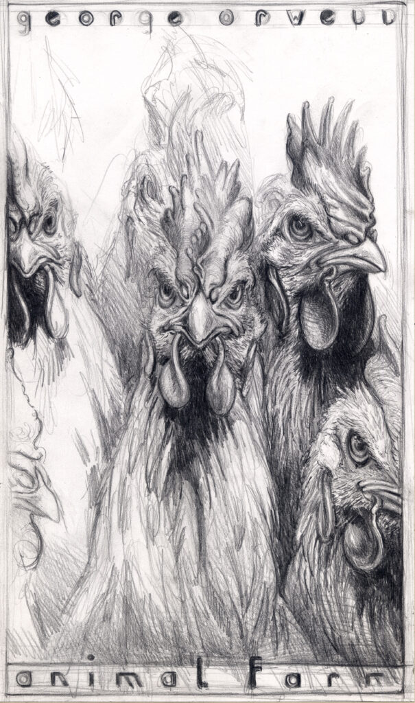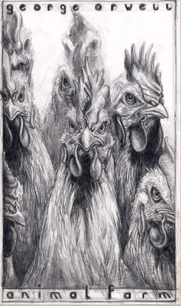 Diese Zeichnung folgt abermals der Intention des Buches Animal Farm von George Orwell und thematisiert den „Aufstand der Hühner“.