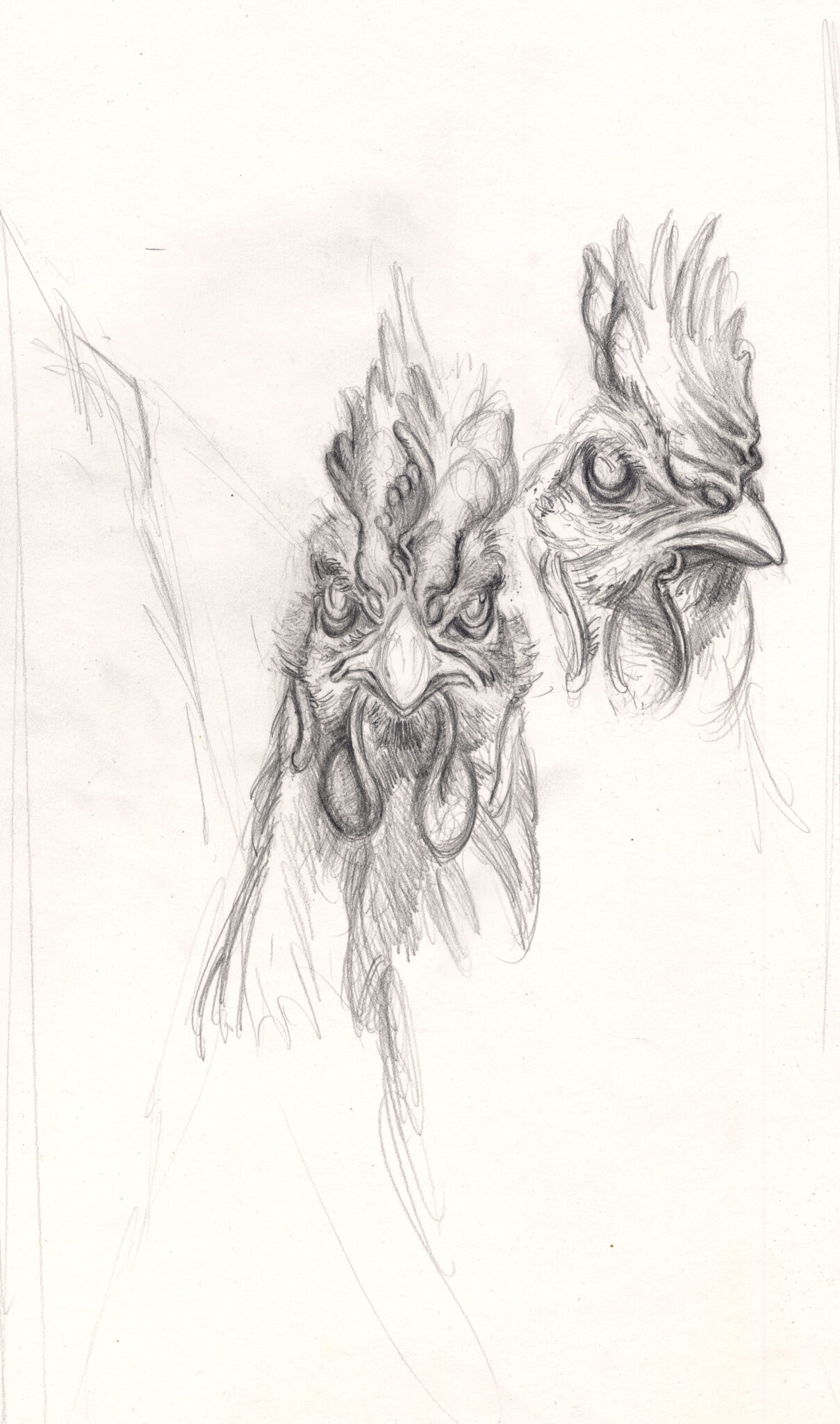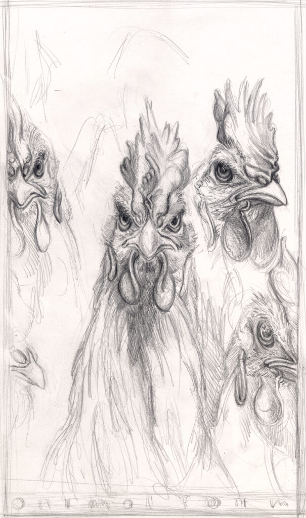 Die Zeichnung greift genau diesen Moment der inneren Spannung auf: Die Hühner wirken entschlossen, wachsam, beinahe kämpferisch. Ihre überzeichneten, intensiven Blicke spiegeln die Mischung aus Angst, Trotz und moralischer Klarheit, die ihren Aufstand prägt. Sie wissen, dass sie verlieren werden – und rebellieren dennoch. Gerade darin liegt ihre tragische Größe.