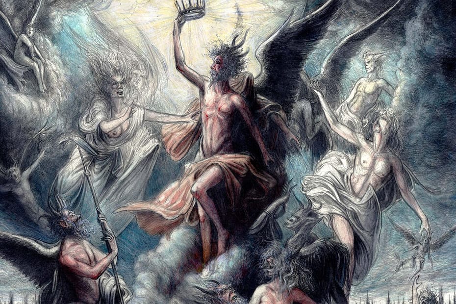 Diese neue, großformatige und opulente Bleistiftzeichnung orientiert sich in Komposition und Farbgebung am flämischen Barock und thematisch an John Miltons… Die Krönung Satans
