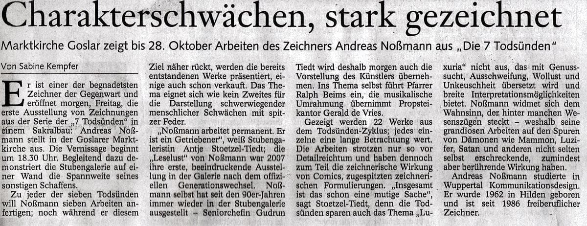 Noßmann widmet sich dem Wahnsinn, der hinter manchen Wesenszügen steckt – weshalb seine grandiosen Arbeiten auf den Spuren von Dämonen wie Mammon, Luzifer, Satan und anderen nicht selten selbst erschreckende, zumindest aber berührende Wirkung haben.