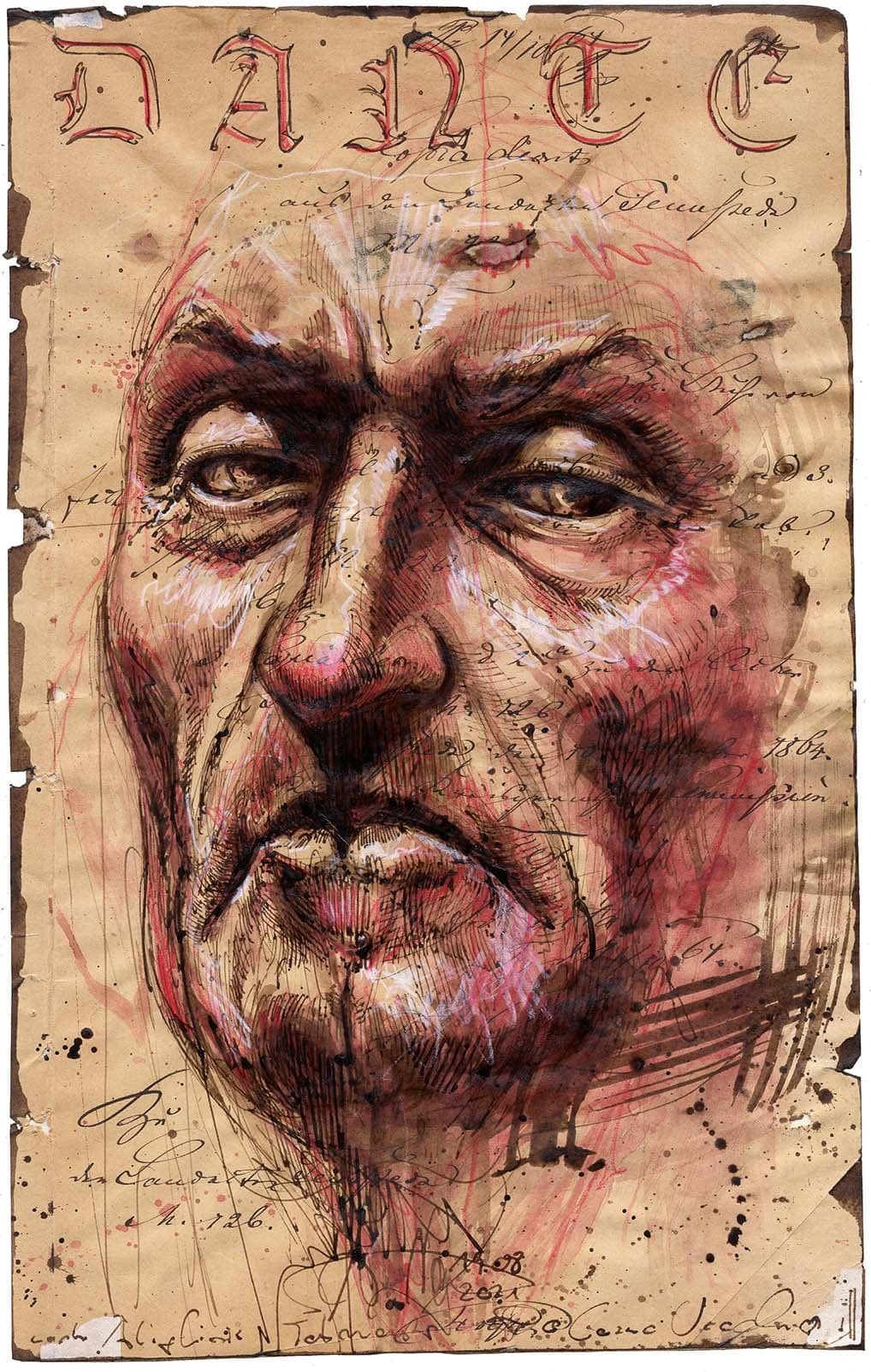 Ein Portrait von Dante anzufertigen stand somit schon länger auf meiner Wunschliste. Doch nur wie? Die wenigen zeitgenössischen Portraits, wie z.B. von Botticelli, sind natürlich, gemäß ihrer Zeit, eher idialiersiert. Und auch die übergroße Statue Dantes, vor den Uffizien in Florenz, könnte mal wohl auch kaum als Vorlage hierzu nutzen. Am Ende blieb mir nur die vermeintliche Totenmaske Dantes, bis heute ausgestellt im Palazzo Vecchio in Florenz, denn diese wurde von Tom Hanks natürlich auch wieder zurückgegeben. Diese war dann eine halbwegs brauchbare Anleitung.