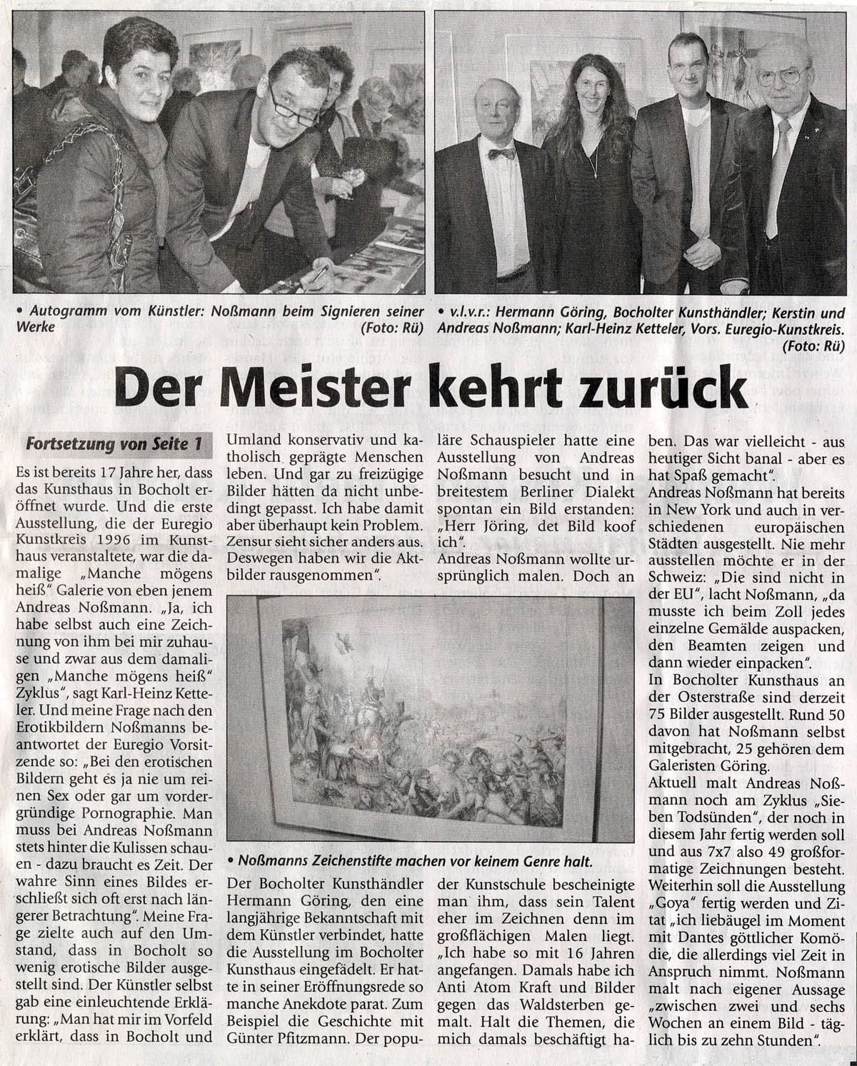 Der Bocholter Kunsthändler Hermann Göring, den eine langjährige Bekanntschaft mit dem Künstler verbindet, hatte die Ausstellung im Bocholter Kunsthaus eingefädelt. Er hatte in seiner Eröffnungsrede so manche Anekdote parat. Zum Beispiel die Geschichte mit Günter Pfitzmann. Der populäre Schauspieler hatte eine Ausstellung von Andreas Noßmann besucht und in breitestem Berliner Dialekt spontan ein Bild erstanden: Herr Jöring, det Bild koof ich“.