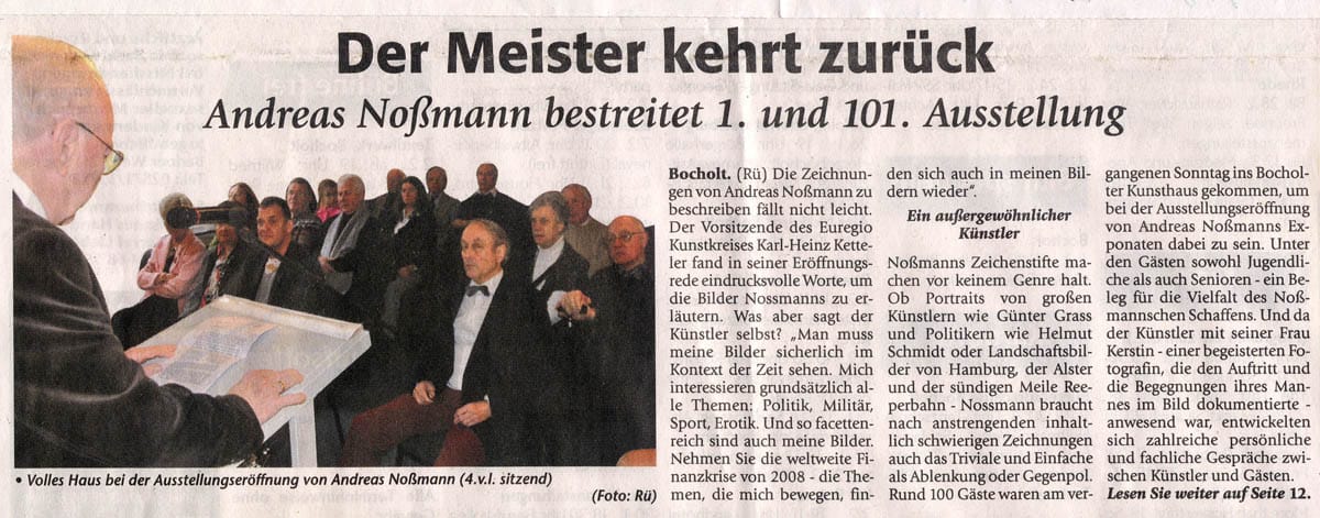 Noßmanns Zeichenstifte machen vor keinem Genre halt. Ob Portraits von großen Küsntlern wie Günter Grass und Politikern wie Helmut Schmidt oder Landschaftsbilder von Hamburg, der Alster und der sündigen Meile Reeperbahn – Noßmann braucht nach anstrengenden inhaltlich schwierigen Zeichnungen auch das Triviale und Einfache als Ablenkung oder Gegenpol. Rund 100 Gäste waren am vergangenen Sonntag ins Bocholter Kunsthaus gekommen, um bei der Ausstellungseröffnung von Andreas Noßmann Exponaten dabei zu sein. Unter den Gästen sowohl Jugendliche als auch Senioren – ein Beleg für die Vielfalt des Noßmannschen Schaffens. Und da der Künstler mit seiner Frau Kerstin – einer begeisterten Fotogafin, die den Auftritt und Begenungen ihres Mannes im Bild dokumentierte – anwesend war, entwickelten sich zahlreiche persönliche Gespräche zwischen Künstler und Gästen.