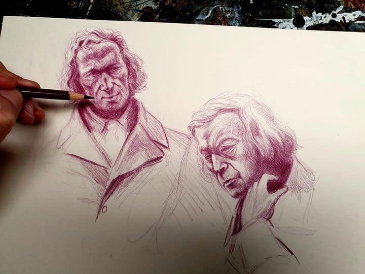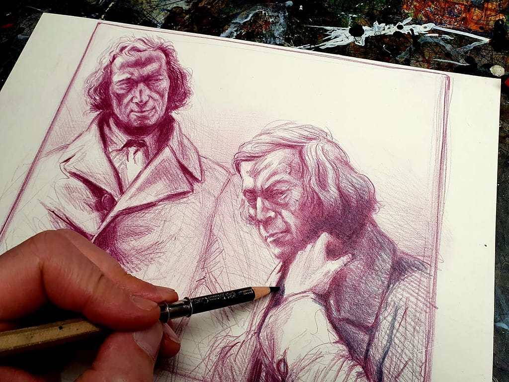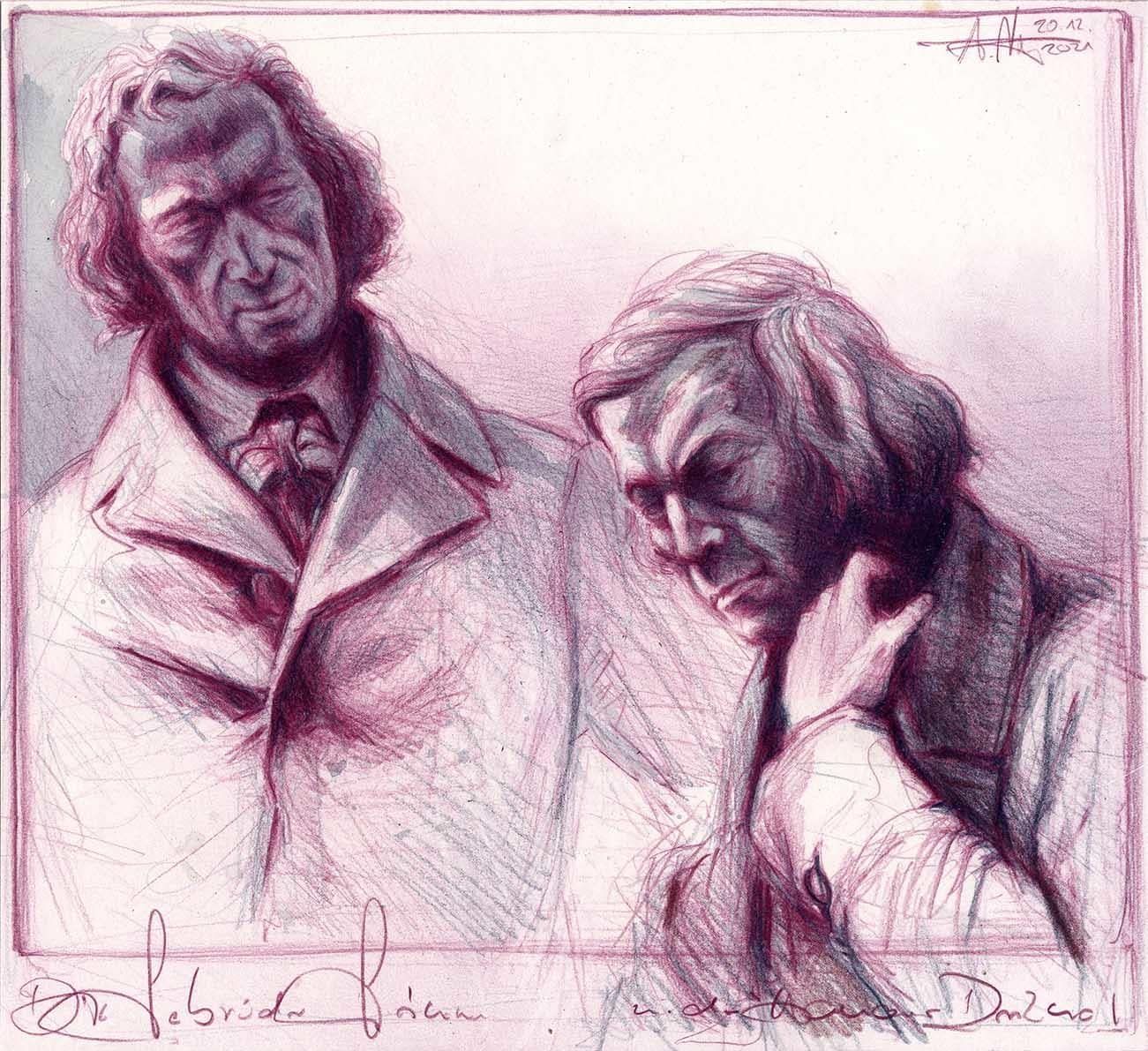 Nachdem ich nicht nur Hans Christian Andersen gezeichnet, sondern mich über diesen auch ausführlich ausgelassen habe, lag es natürlich nahe mich auch nochmals mit seinen einstigen Vorbildern, den Gebrüder Grimm, erneut zu beschäftigen – zumindest in Form einer Doppel-Portraitumsetzung, welches nach dem allseits bekannten Denkmal zu Hanau entstand.