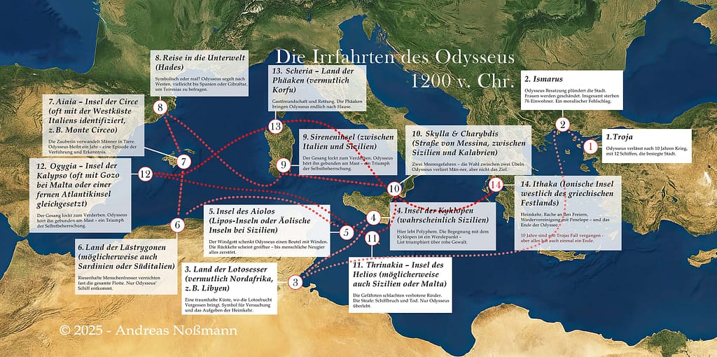 An dieser Stelle mal keine neue Zeichnung, sondern eine von mir in Photoshop mühsam selbst erstellte Grafik zu den 14 Stationen des verbannten Odysseus – frei nach Homer. Denn gerne hätte ich solch eine Grafik in meinem neuen Buch – Caelum et Infernum – welches Anfang kommenden Jahres erscheinen soll, passend präsentiert. Doch wenn man nichts zwingend logisches findet, auf das man sich berufen könnte, dann muss man es halt selbst machen. Vermutlich haben wirkliche Experten/Historiker einiges daran zu bemängeln, aber zwingend einheitliche Quellen, zu so einer fiktiven Karte, waren schlicht nicht zu finden.