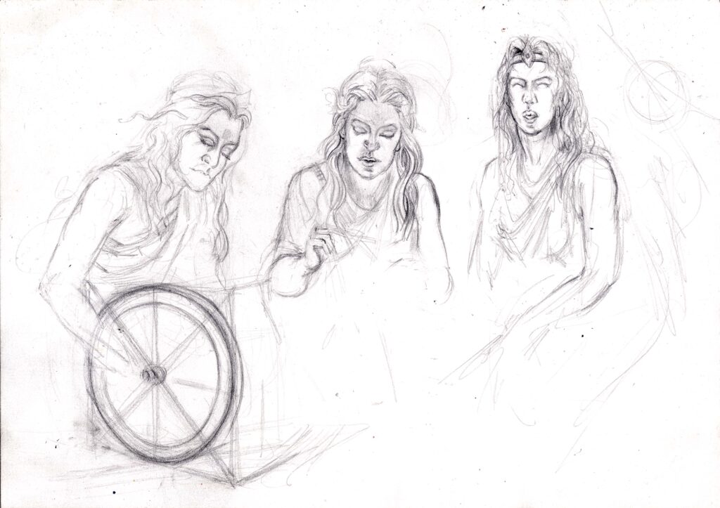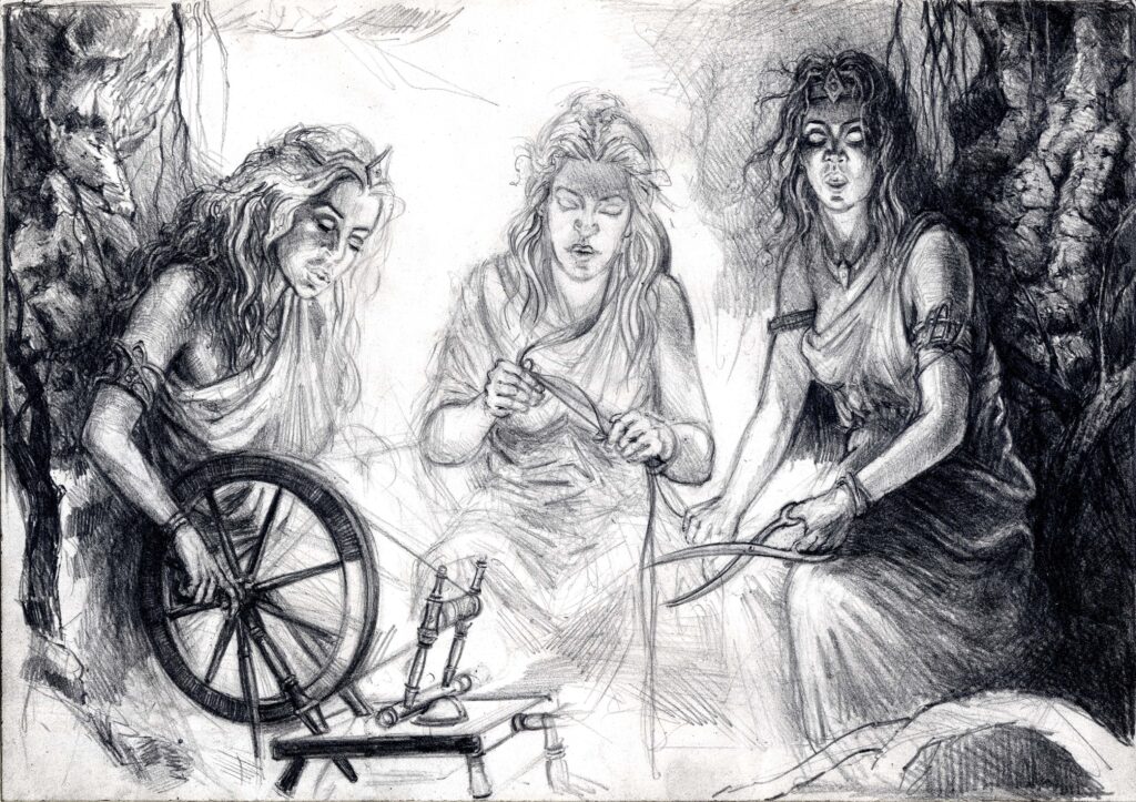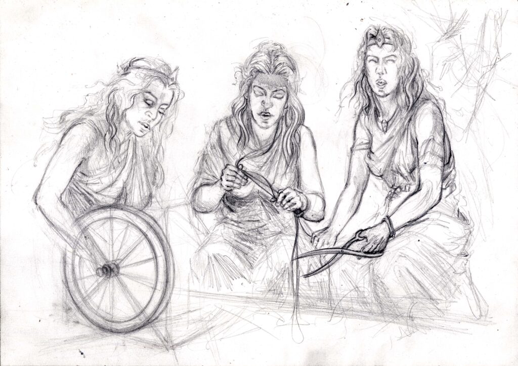 Aus der Verbindung von Zeus, dem Herrscher des Himmels und des Olymps, und Themis, der Verkörperung göttlicher Gerechtigkeit, entspringen drei junge Frauen, scheinbar apathisch, mit leerem Blick und abseits der bekannten Welt lebend, deren Macht und Willen die Götter selbst nicht brechen und beeinflussen können: die Moiren – im römischen auch bekannt als die drei Parzen. Sie sind nicht bloß Weberinnen des Schicksals – sie sind dessen Gesetzgeberinnen, geboren aus dem Willen zur Ordnung und dem Streben nach Maß.
