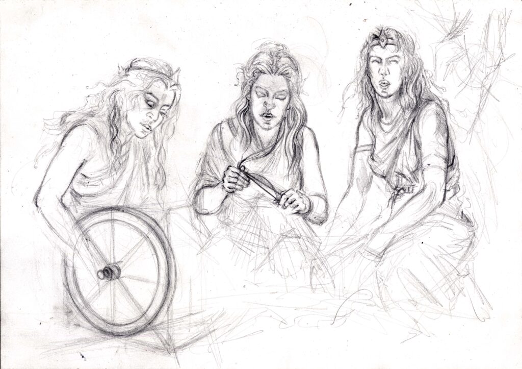 Klotho, die Erste, tritt aus dem Morgennebel und spinnt den Lebensfaden aus dem Stoff der Möglichkeiten. Jeder Mensch, jedes Wesen erhält durch sie seinen Anfang – unscheinbar, aber unumkehrbar.