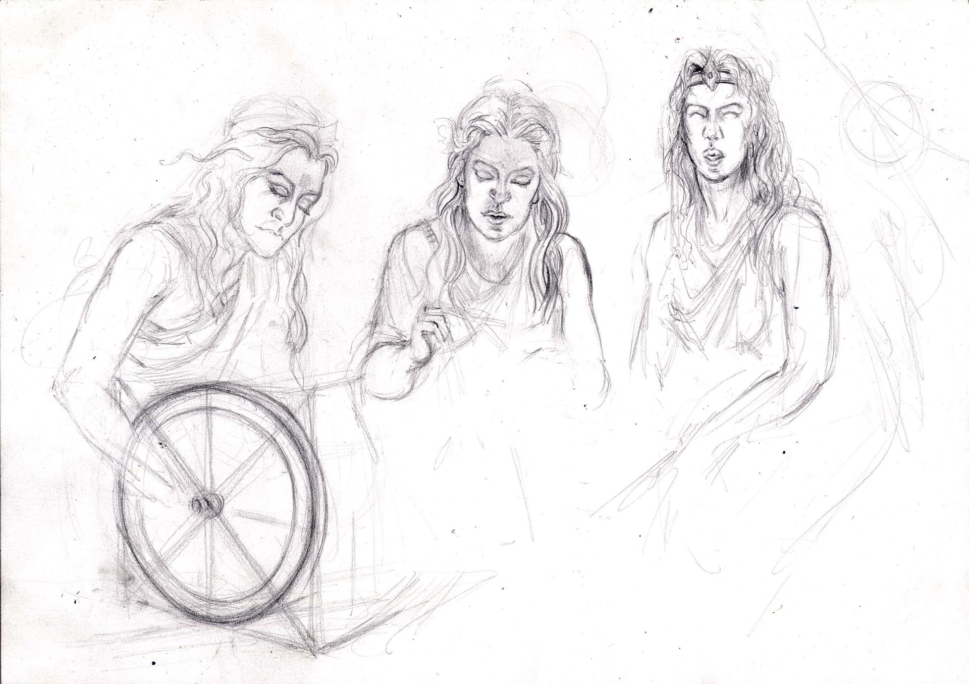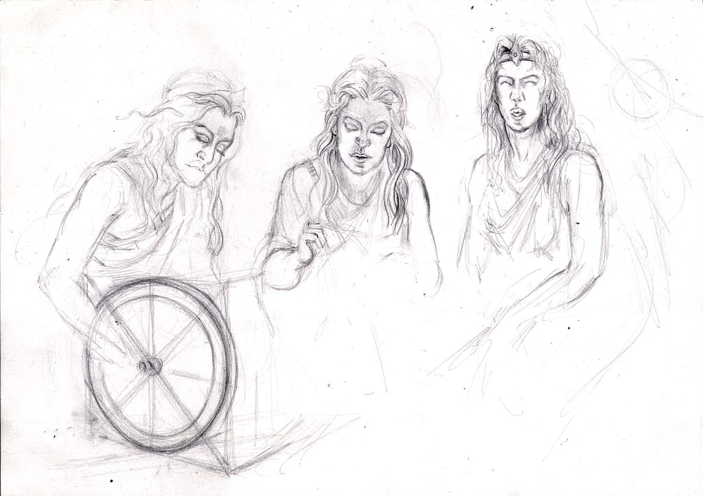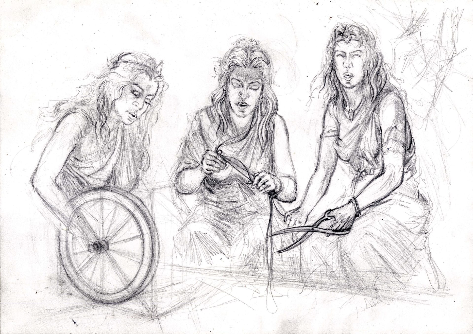 Aus der Verbindung von Zeus, dem Herrscher des Himmels und des Olymps, und Themis, der Verkörperung göttlicher Gerechtigkeit, entspringen drei junge Frauen, scheinbar apathisch, mit leerem Blick und abseits der Welt hausend, deren Macht und Willen aber die Götter selbst nicht brechen können: die Moiren. Sie sind nicht bloß Weberinnen des Schicksals – sie sind dessen Gesetzgeberinnen, geboren aus dem Willen zur Ordnung und dem Streben nach Maß.