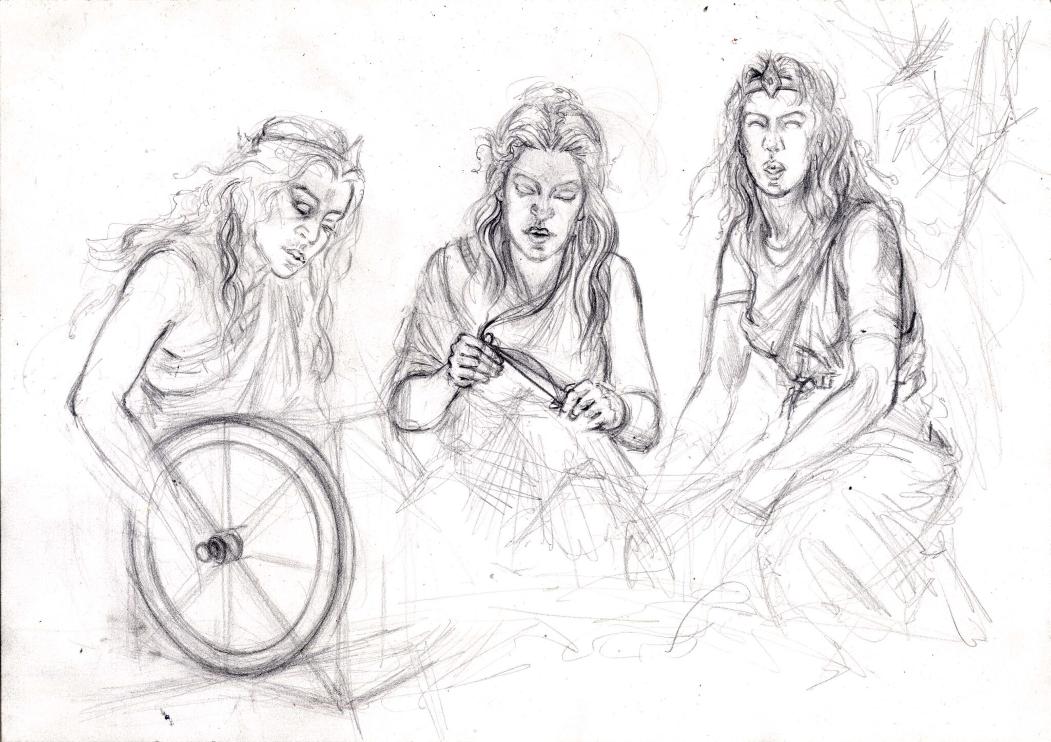 Aus der Verbindung von Zeus, dem Herrscher des Himmels und des Olymps, und Themis, der Verkörperung göttlicher Gerechtigkeit, entspringen drei junge Frauen, scheinbar apathisch, mit leerem Blick und abseits der bekannten Welt lebend, deren Macht und Willen die Götter selbst nicht brechen und beeinflussen können: die Moiren – im römischen auch bekannt als die drei Parzen. Sie sind nicht bloß Weberinnen des Schicksals – sie sind dessen Gesetzgeberinnen, geboren aus dem Willen zur Ordnung und dem Streben nach Maß.