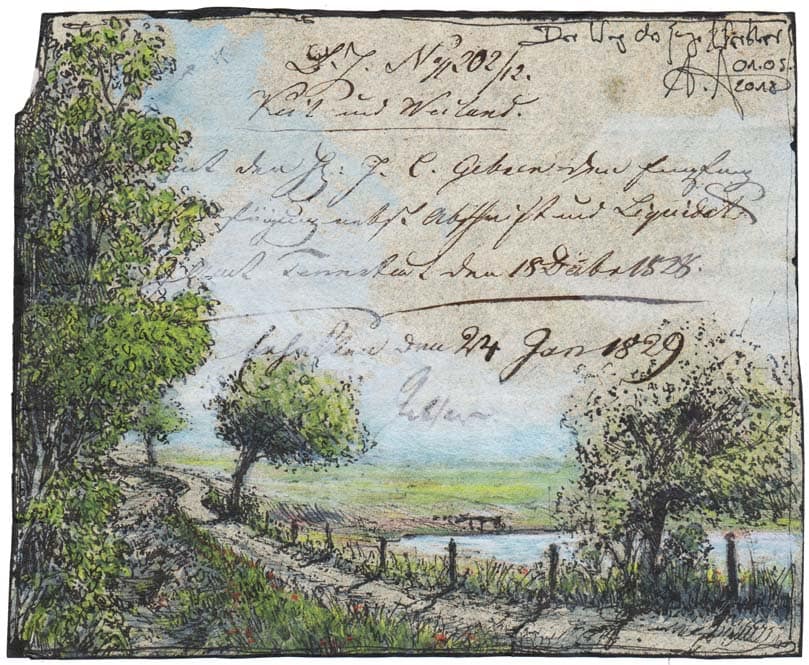 Hier z.B., auf diesem Weg des jungen Werther, ist ein handschriftlicher Eintrag vom 24ten Januar 1829 auf dem ursprünglichen Papier noch recht gut zu erkennen. Der Eintrag darüber – 18ter Dezember 1828. Wer weiß schon, was da passiert ist? Auch wenn es zeitlich passen würde, er stammt ganz sicher nicht von Goethe selber … aber immerhin!