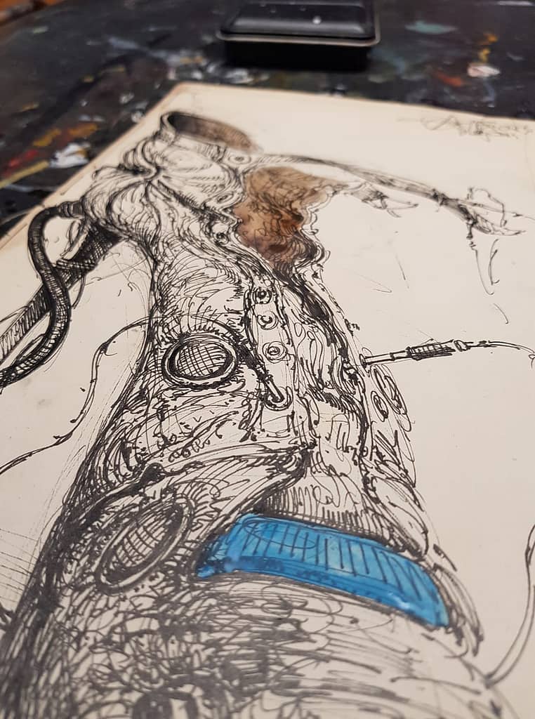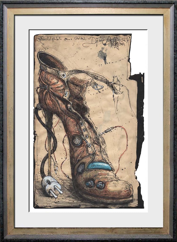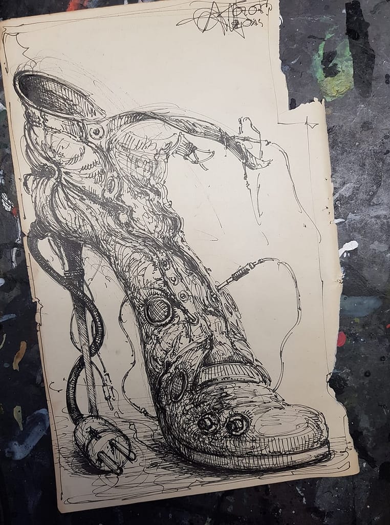 Das Thema Schuh, in der Zeichnung meinerseits, ist natürlich für mich ab und zu auch eine willkommene Spielwiese und Abwechselung, wenn es nur darum geht die Feder mal recht gedankenlos entspannt über das alte Papier tänzeln zu lassen und eigentlich völlig absurden Assoziationen genügend Spielraum einzuräumen. Aber eine Spielwiese ist und bleibt natürlich eben nur eine solche, wenn auch diese mich in Teilen selber mehr als amüsiert.