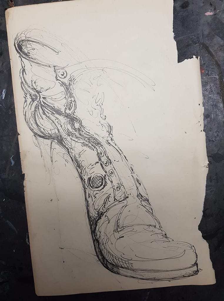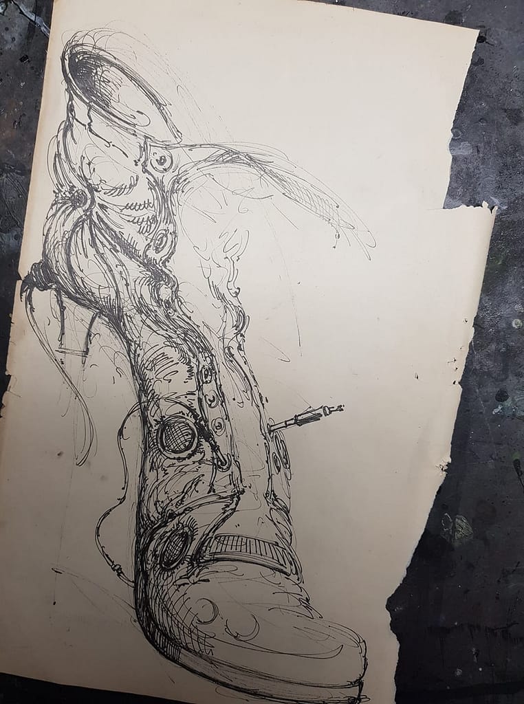 Das Thema Schuh, in der Zeichnung meinerseits, ist natürlich für mich ab und zu auch eine willkommene Spielwiese und Abwechselung, wenn es nur darum geht die Feder mal recht gedankenlos entspannt über das alte Papier tänzeln zu lassen und eigentlich völlig absurden Assoziationen genügend Spielraum einzuräumen. Aber eine Spielwiese ist und bleibt natürlich eben nur eine solche, wenn auch diese mich in Teilen selber mehr als amüsiert.