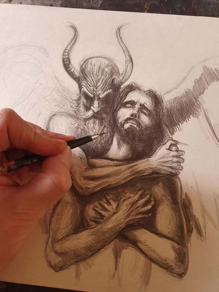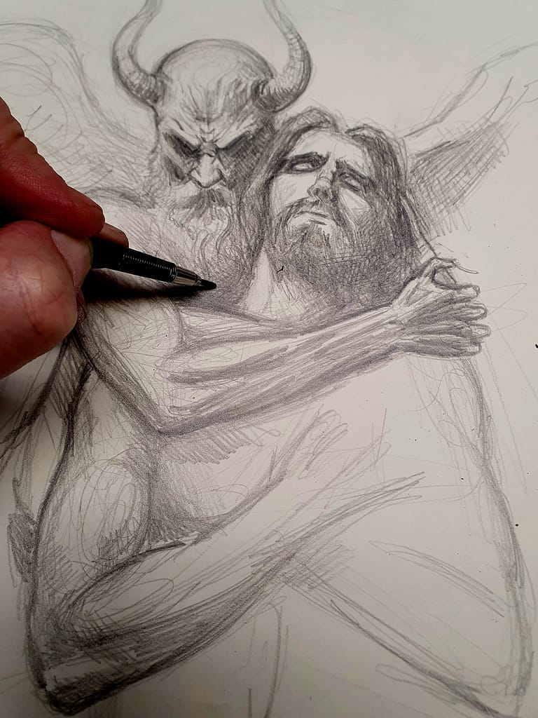 Die Zeichnung könnte den Moment darstellen, in dem der Teufel Jesus in der Wüste versucht und versucht, ihn zu verführen, indem er ihm materielle und weltliche Belohnungen anbietet, wie in den zitierten Bibelstellen beschrieben. Die Umarmung des Teufels kann die intensive Nähe und den psychologischen Druck darstellen, dem Jesus ausgesetzt ist. Die Darstellung von Jesus in einer umarmten, aber nicht besiegten Haltung kann seine Standhaftigkeit und den letztendlichen Sieg über die Versuchung symbolisieren.