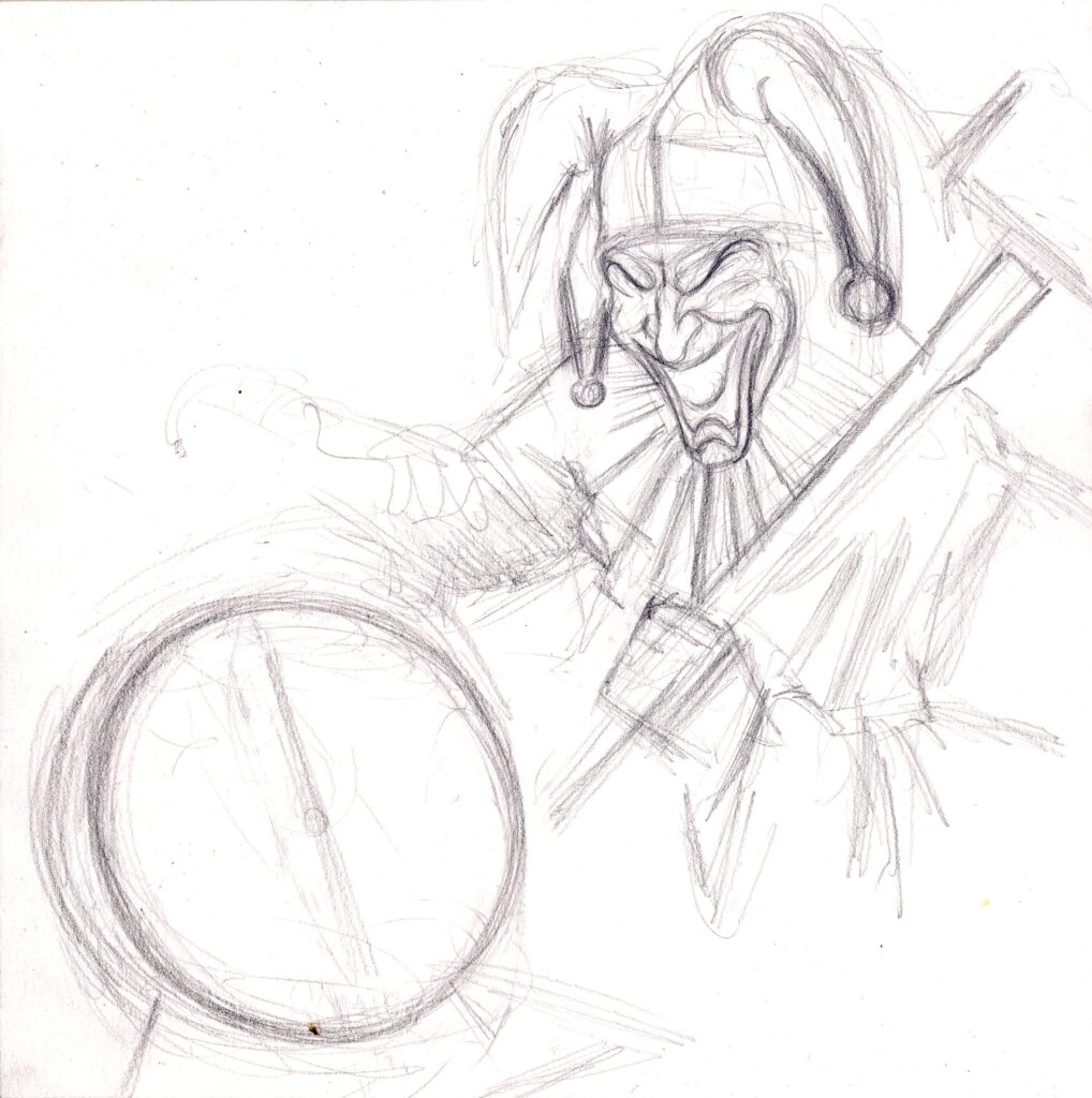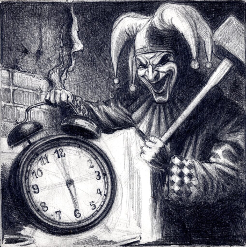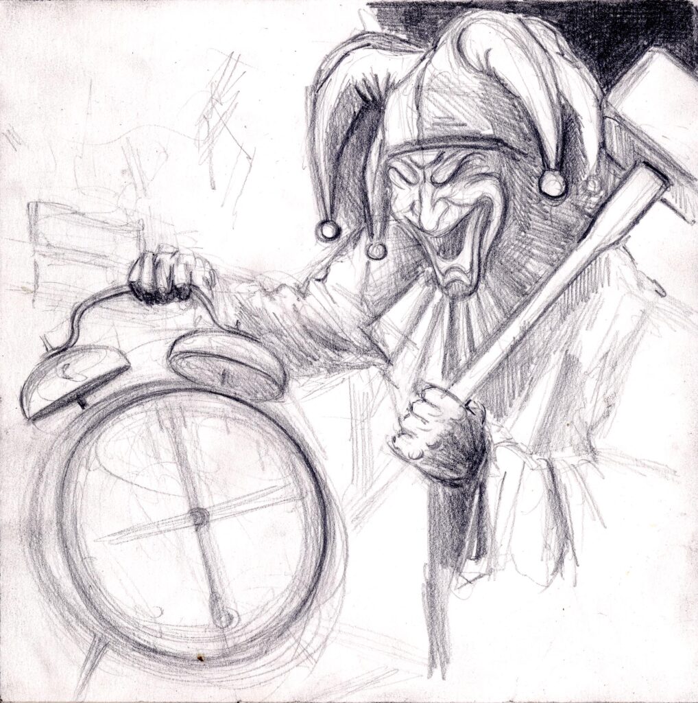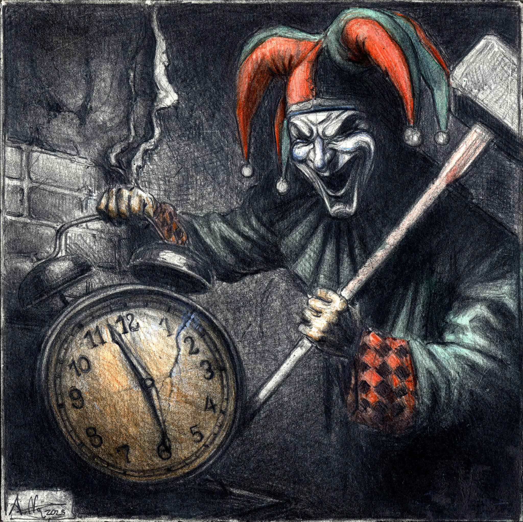 Wieder jene Figur, die man vielleicht schon – nicht nur von mir – bereits zu kennen glaubt. Hier in einer Art des modernen Kronos, der die Endlichkeit, aber auch Unendlichkeit der Zeit verkörpert – und beides auf ewig vermessen muss. Der clowneske Dämon ist zugleich komisch aber auch beängstigend. Er droht, mit einem übergroßen Hammer bewaffnet, der mechanisierten Zeit, in Form einer riesigen Uhr, wohl wissend, dass vieles im Universum zwar grenzenlos erscheint, aber allem Leben eben die Ewigkeit nicht innewohnt. So, oder so ähnlich …