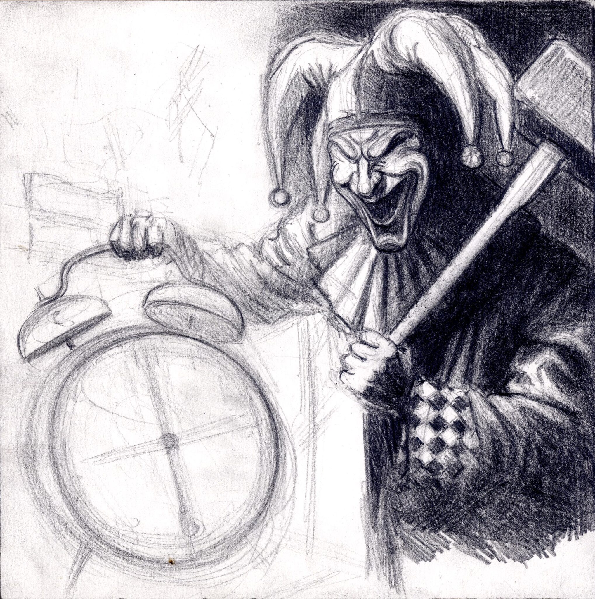 Wieder jene Figur, die man vielleicht schon – nicht nur von mir – bereits zu kennen glaubt. Hier in einer Art des modernen Kronos, der die Endlichkeit, aber auch Unendlichkeit der Zeit verkörpert – und beides auf ewig vermessen muss. Der clowneske Dämon ist zugleich komisch aber auch beängstigend. Er droht, mit einem übergroßen Hammer bewaffnet, der mechanisierten Zeit, in Form einer riesigen Uhr, wohl wissend, dass vieles im Universum zwar grenzenlos erscheint, aber allem Leben eben die Ewigkeit nicht innewohnt. So, oder so ähnlich …