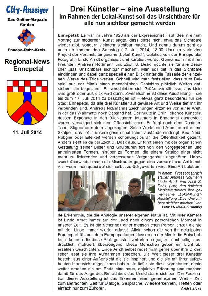 Ennepetal: Es war im Jahre 1920 als der Expressionist Paul Klee in einem Vortrag zur modernen Kunst sagte, dass diese nicht etwa das Sichtbare wieder gibt, sondern vielmehr sichtbar macht. Und genau darum geht es auch ab kommenden Samstag (12. Juli 2014, 18:00 Uhr) im vorletzten Projekt der Veranstaltungsreihe „Lokal-Kunst“, welches von der Ennepetaler Fotografin Linde Arndt organisiert und kuratiert wurde. Gemeinsam mit ihren Freunden Andreas Noßmann und Zsolt S. Deák möchte sie für alle Besu- cher „das Unsichtbare sichtbar machen“. Man soll tief in das Sichtbare eindringen und dabei ganz speziell einen Blick hinter die Fassade der einzel- nen Werke des Trios werfen. Schnell wird man feststellen, dass zum Bei- spiel aus der Mimik eines menschlichen Gesichtes plötzlich Welten ent- stehen, die begeistern. Es verschieben sich Größenverhältnisse, aus klein wird groß oder aus dick wird dünn. Zweifelsohne ist diese Ausstellung – die bis zum 17. Juli 2014 zu besichtigen ist – etwas ganz besonderes für die Stadt Ennepetal, da alle drei Künstler auf gewisse Art und Weise tief mit ihr verbunden sind. Andreas Noßmanns Zeichnungen erzählen von einer Welt, in der das Wahrhafte noch Bestand hat. Der heute in Brühl lebende Künstler, dessen Exponate in den 90er-Jahren letztmals in Ennepetal ausgestellt waren, verweigert sich dem Offensichtlichen. Er fragt nach dem Dahinter, Tabu, Stigma oder dem Ungesagten. Seine Werke sind Arbeiten mit einem Skalpell, das tief in unsere gesellschaftlichen Zustände eindringt. Sex, Neid, Habgier oder Eitelkeit werden schonungslos an die Öffentlichkeit gezerrt. Anders sieht es da bei Zsolt S. Deák aus. Er führt einen mit der organischen Gestaltung seiner Bilder und Skulpturen fort von den vorgegebenen und antrainierten Formen, hinüber zu Formen, die einem Katalog einer nicht mehr zu fixierenden und vergessenen Vergangenheit angehören. Unbe- wusst überwindet man sein Misstrauen gegen eine vermeintliche Antikunst. Als wenn man quasi auf sich selbst zurückgeworfen wird. Eine Art beleben-