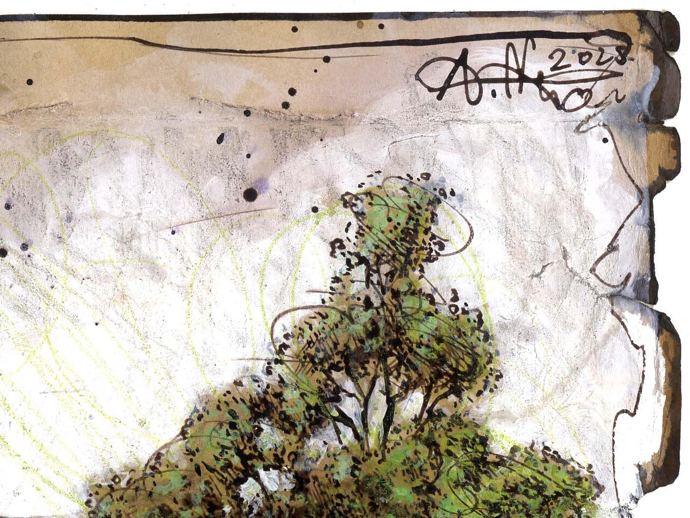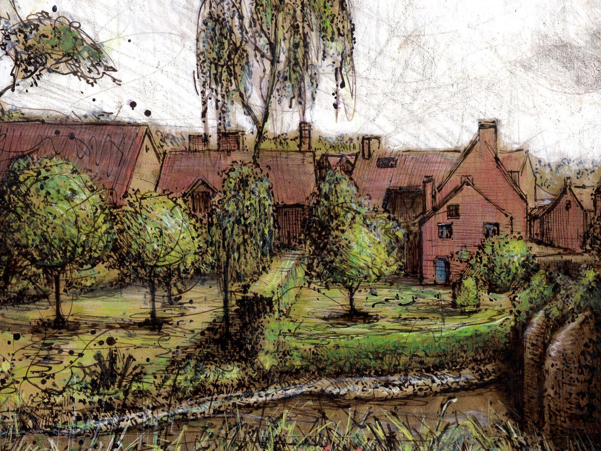 Und nun noch ein weitere neue Landschaftszeichnung, aber von ganz anderer Natur und Wirkung als die obige. Frühling, Sommer, Herbst oder Winter, wer weiß das schon so genau, in welcher Jahreszeit dieses vergessene Dorf auf der andere Seite eines kleinen Flusses vor sich hin schlummert. Bei dieser Zeichnung wurde die Feder mit Sepiatusche genutzt, um das Motiv und Komposition zu finalisieren – das Papier, eine Seite einer alten Grundbuchakte aus dem 19ten Jhdt., gibt nicht nur einen gänzlich anderen Grundton vor, als der Passepartout Karton, sondern führt auch so ein wenig ein Eigenleben. Die weiteren Schritte, hinsichtlich der Kolorierung, unterscheiden sich so gut wie gar nicht – sind identisch zur Winterlandschaft oben. D.h. zeichnen, kolorieren, zeichnen, kolorieren, zeichnen, kolorieren, usw.