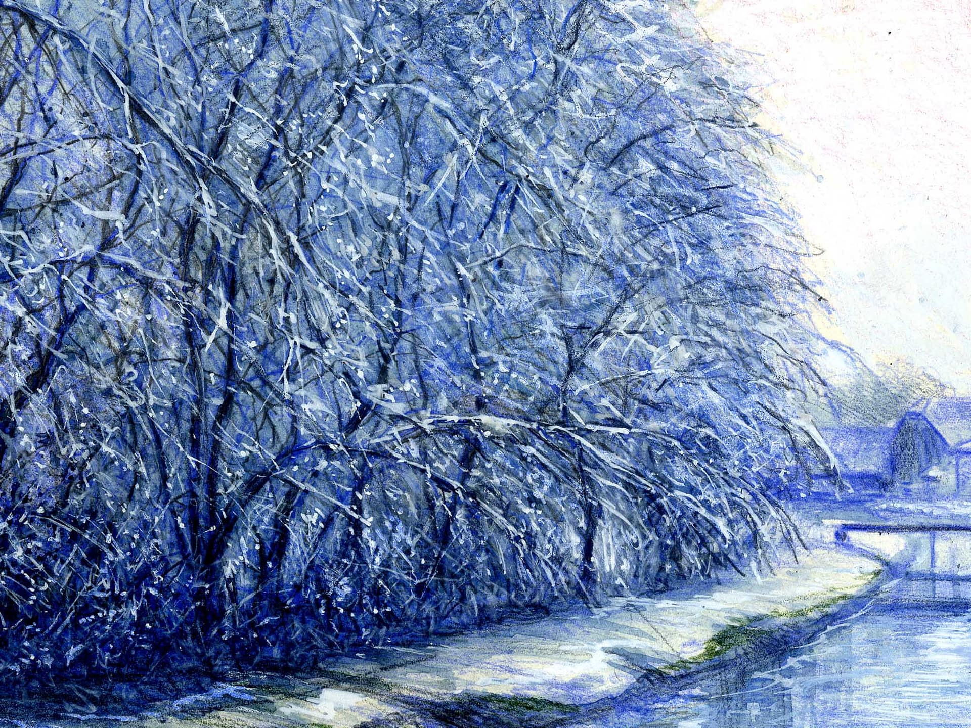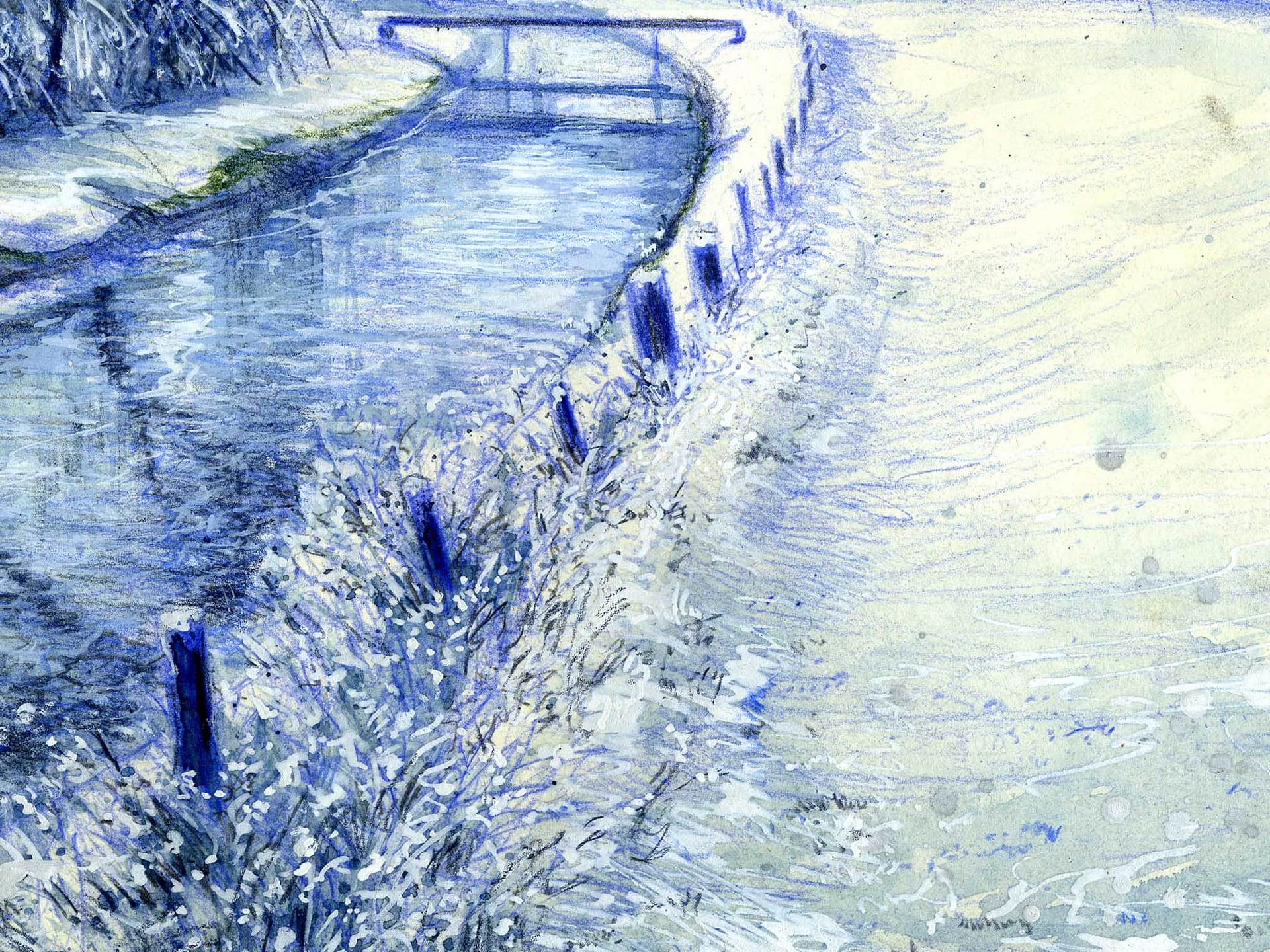 Mal so zwischendurch, mal ganz was anderes als zuletzt: Eine Winterlandschaft, die ich bisher so noch nie angegangen bin. Das ganze Konzept und Komposition der Landschaft wurde tatsächlich erst einmal mit nur einem Polychromos Farbstift (Ultramarin 120), nach und nach, bis in kleinste Detail, aufgebaut. Hierbei wurde natürlich die volle Bandbreite von Hell und Dunkel (wenig Druck, maximum Druck) dieses eines Farbtones genutzt. Dann erst wurde mit passenden Aquarell Blautönen erste Verdichtungen angelegt. Nach dem Austrocken erfolgten weitere, zahlreiche zeichnerische Kontrast Nacharbeiten – mal mit einem 4B Bleistift – mal mit einem Polychomos im Ton „Indigo – 157“. Dieses hin und her von aquarellieren und nachzeichnen, habe dann noch zwei, bis dreimal wiederholt. Im Endstadium habe ich dann, da das Papier (300g Hahnemühle Passepartout Karton) eine leichte Gelbtönung hat, mit weißer Tusche, teils abgedunkelt mit passend blauer Aquarellfarbe, die zahlreichen mit Schneebedeckten Bereiche des Geästes, der Landschaft im Ganzen, sowie auch die helleren Reflektionen des Wassers, noch weiter akzentuiert. Und am Ende kann ich mal wieder gar nicht so genau sagen, wie oft ich für das Finish, zwischen Zeichnen und Aquarellieren, hin und her gewechselt bin. Ganz nett das Ergebnis, wie ich finde, denn die Blutspur eines Verblutenden im Schnee, habe ich mir hier dann doch einmal verkniffen.