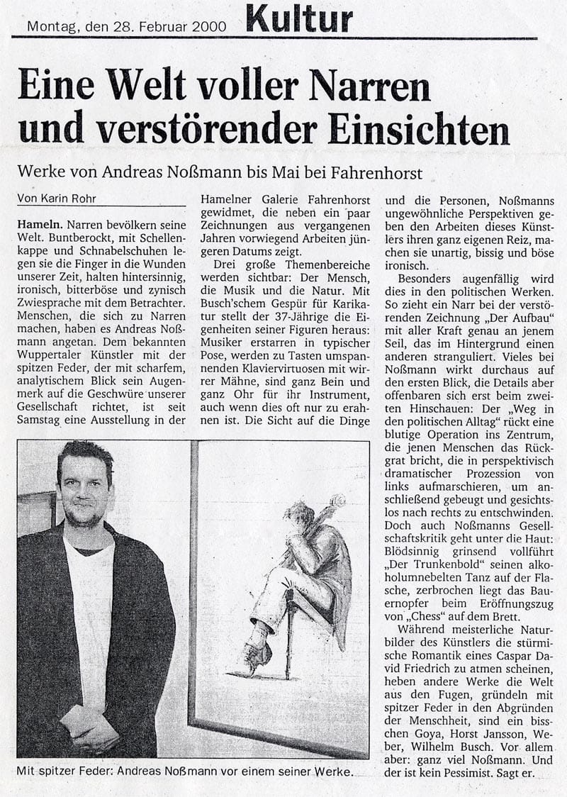 Narrenbevölkern seine Welt. Buntberockt, mit Schellenkappe und Schnabelschuhen legen sie den Finger in die Wunden unserer Zeit, halten hintersinnig, ironisch, bitterböse und zynisch Zwiesprache mit dem Betrachter. Menschen, die sich zum Narren machen, haben es Andreas Noßmann angetan. Dem bekannten Wuppertaler Künstler mit der spitzen Feder, der mit scharfem, analytischem Blick sein Augenmerk auf die Geschwüre unserer Gesellschaft richtet, ist seit Samstag eine Ausstellung in der Hamelner Galerie Fahrenhorst gewidmet, die neben ein paar Zeichnungen aus vergangenen Jahren vorwiegend Arbeiten jüngeren Datums zeigt.