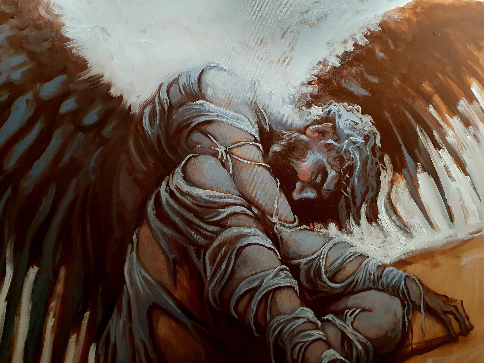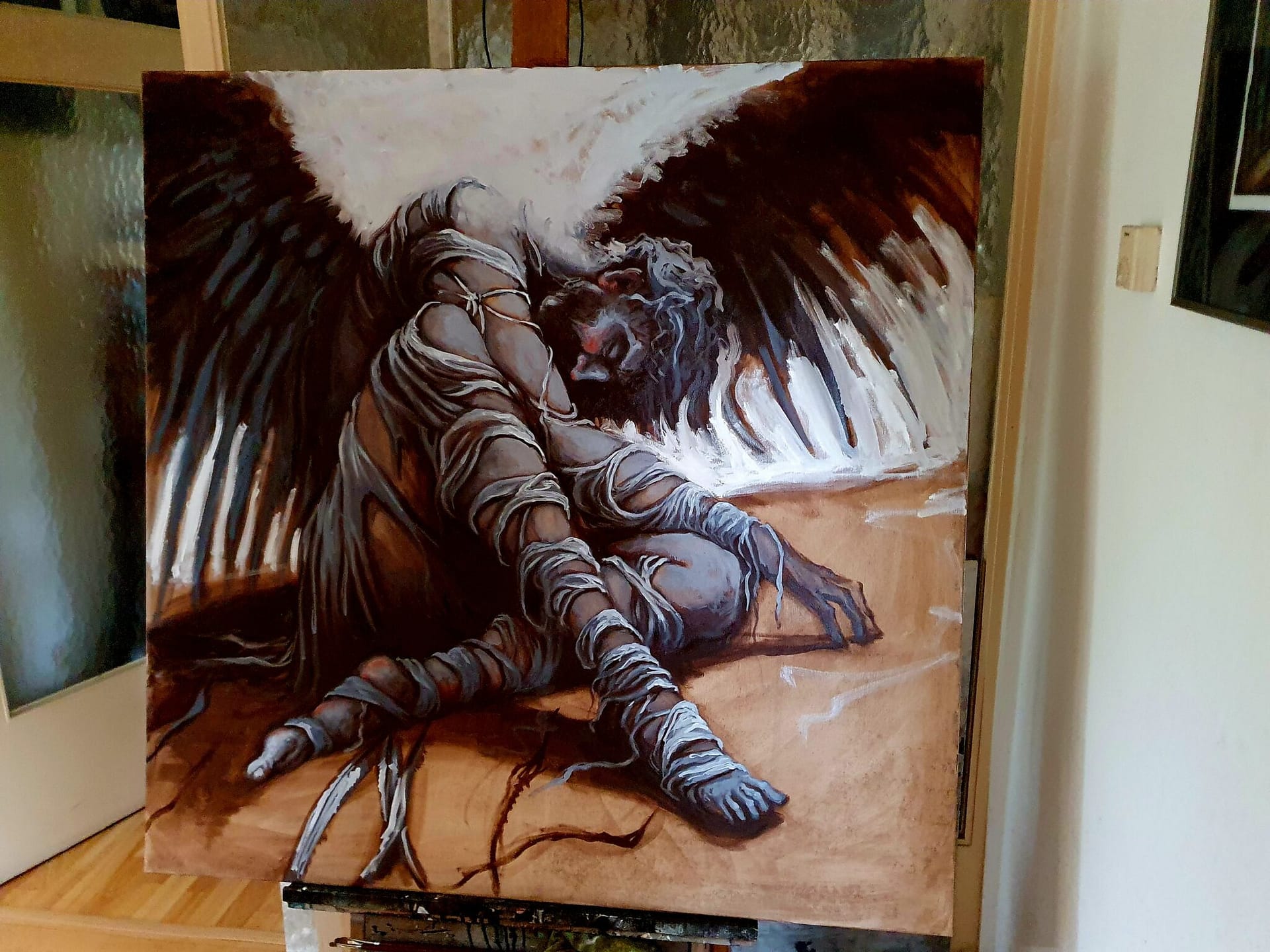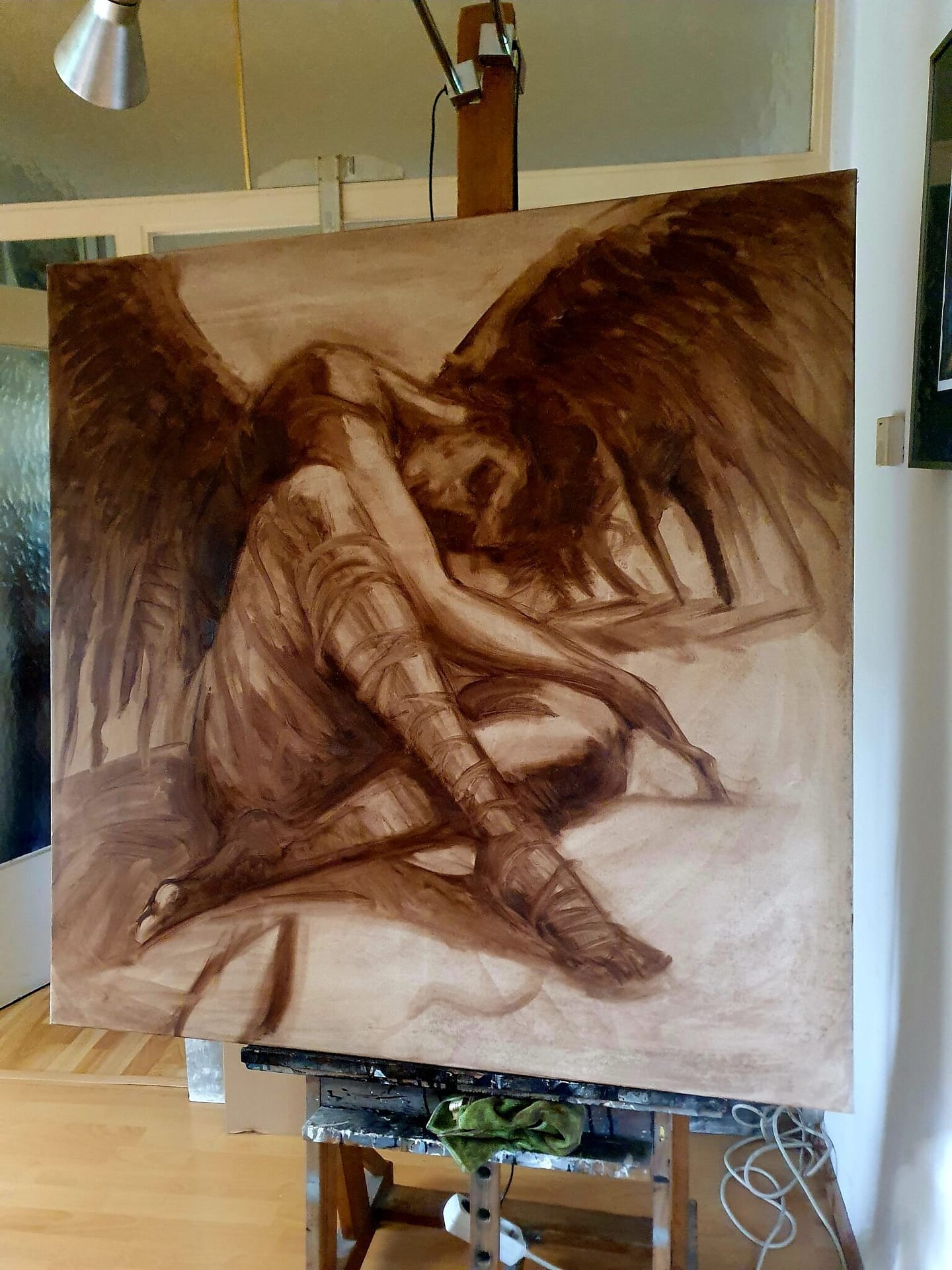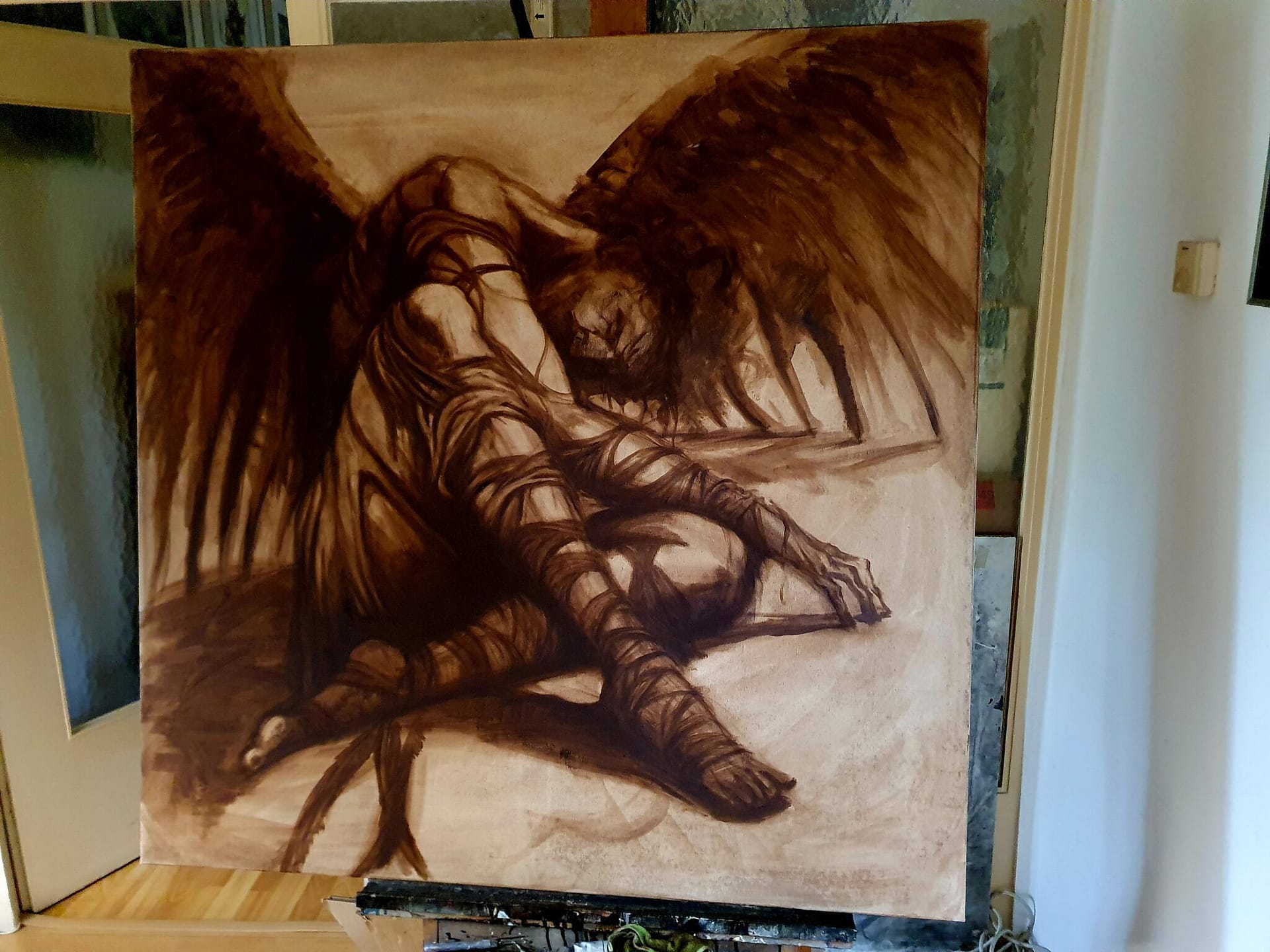 Mit dem Format 120 x 120 cm habe ich mir da echt was aufgehalst. Die Szene soll einen gefallenen Engel darstellen – „inspiriert“ von dem Film Constantin (2005), in dem Tilda Swinton den Erzengel Gabriel spielt und dabei eben nicht die allseits bekannte wallende Robe trägt, sondern eher ein eindrucksvoll, sie umwickelndes Sammelsurium. Da dieses Bild mal keine Zeichnung ist und wird, sondern sich ausnahmsweise mal der reinen Malerei verschreibt, bin ich selbst auf das Ergebnis sehr gespannt. Ich wollte mir das ganz einfach auch mal gönnen.