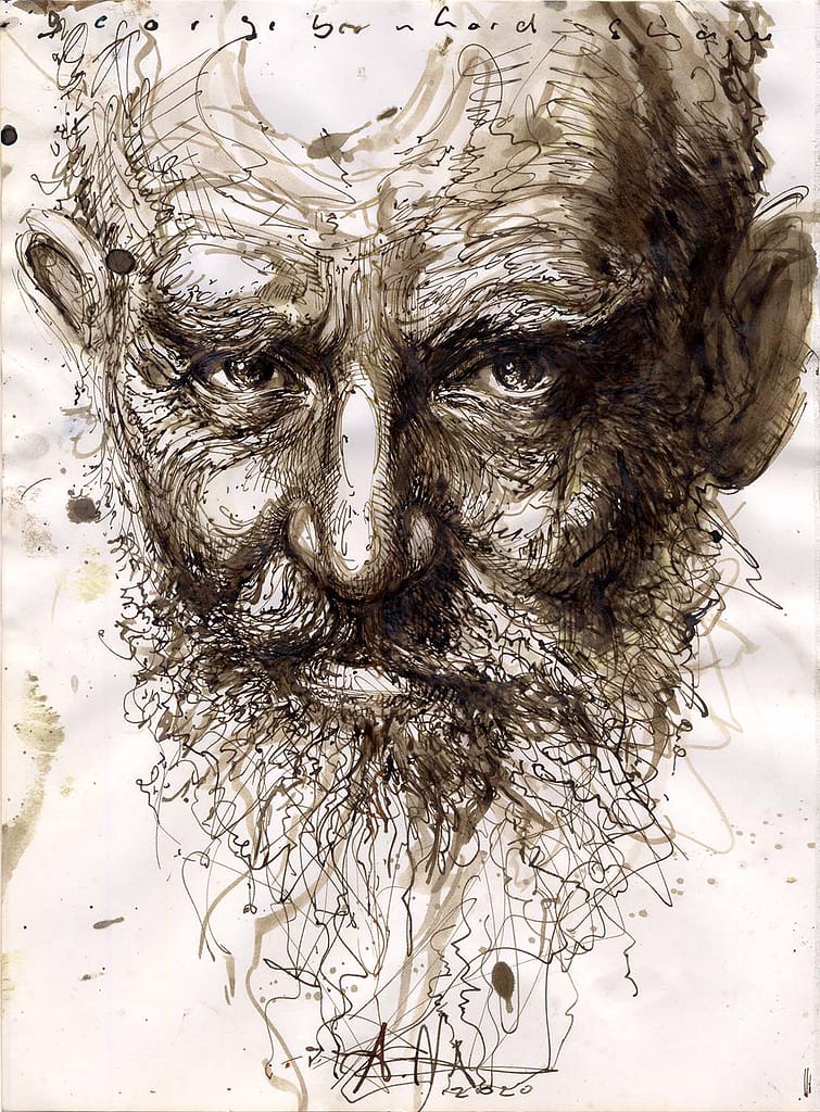 Es ist wieder passiert. Der gute George Bernhard Shaw, irischer Schriftsteller, welcher 1925 den Nobelpreis für Literatur erhielt, ist mir erneut, genauer, jetzt zum vierten Male schon, abermals unter die Feder geraten. Hinzu kommen noch eine Lithografie von 2010 und sogar eine Kaltnadelradierung aus den späten 1980er Jahren, von denen ich aber leider derzeit keine Abbildung mehr finden konnte.