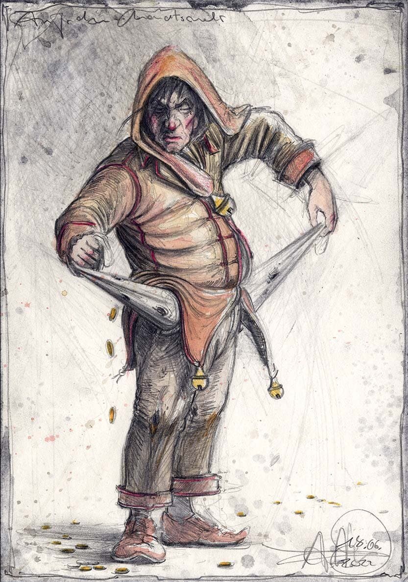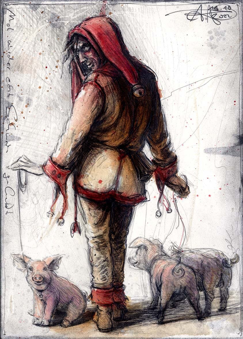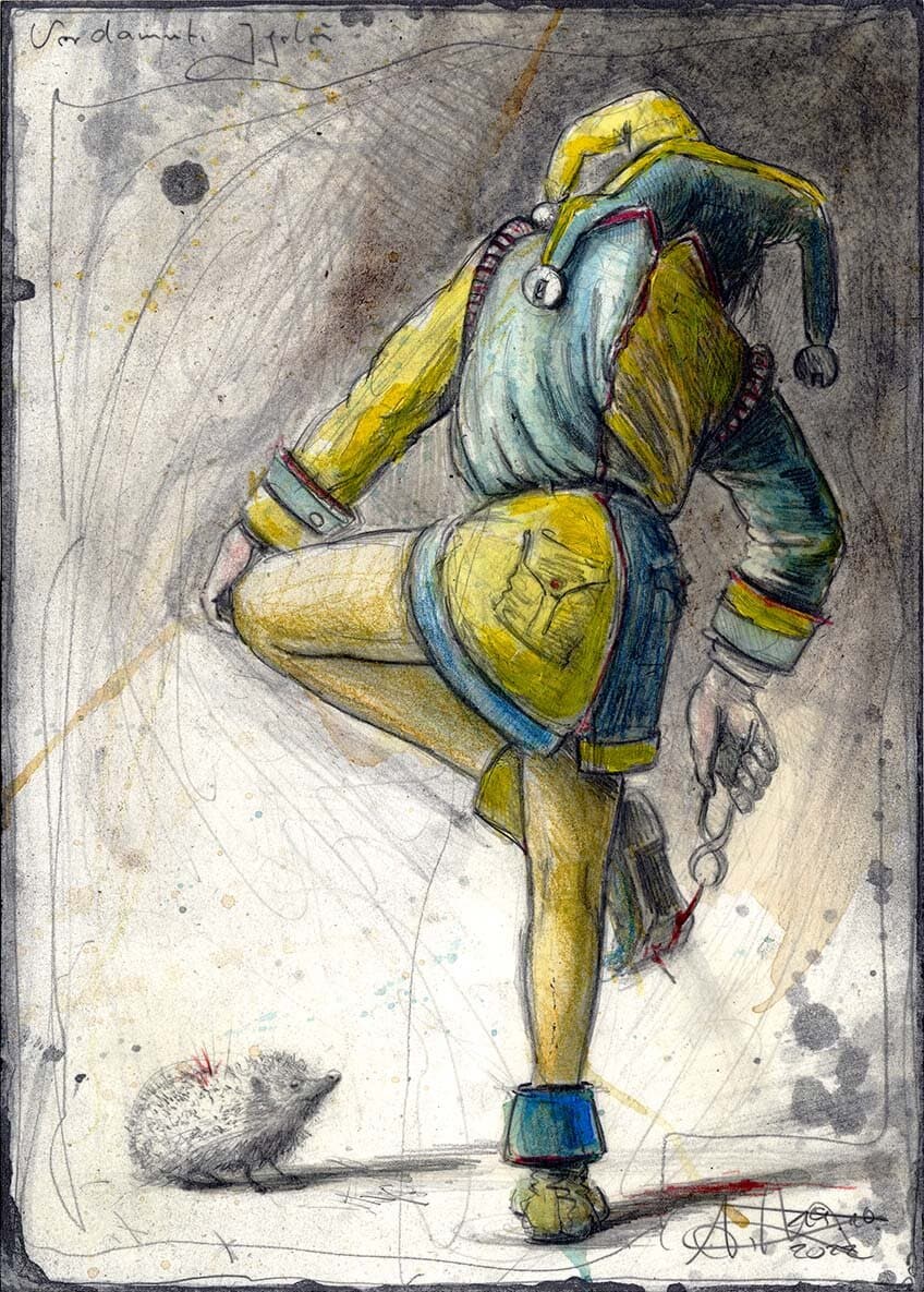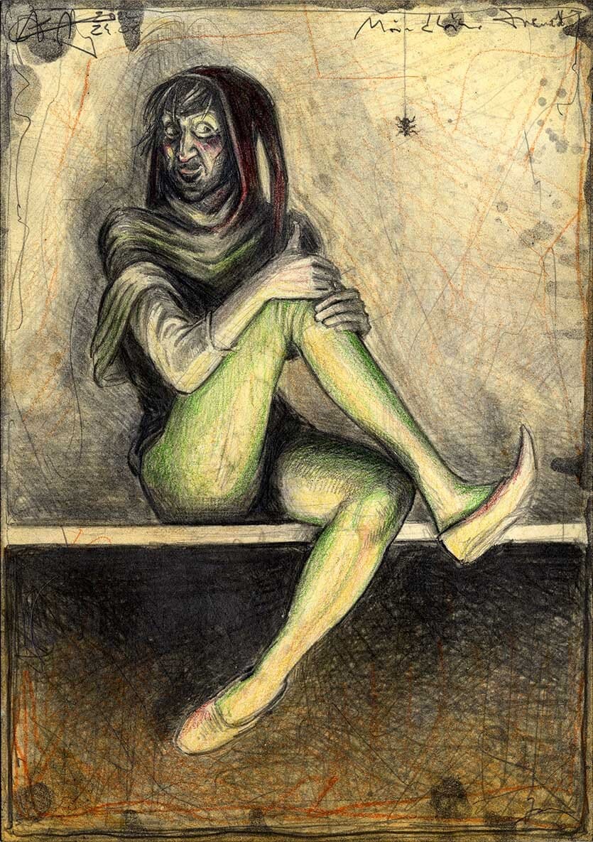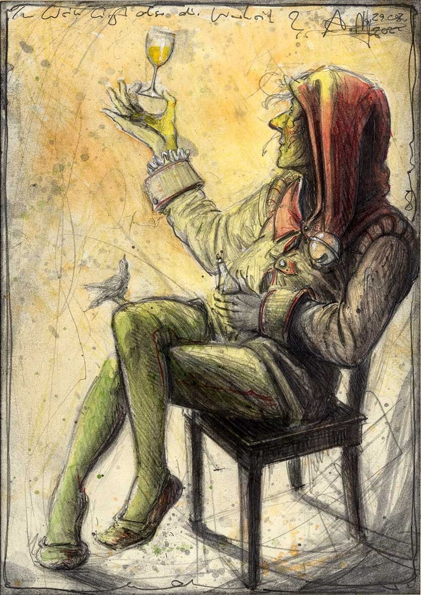 Federzeichnung, Farbstift, Aquarell