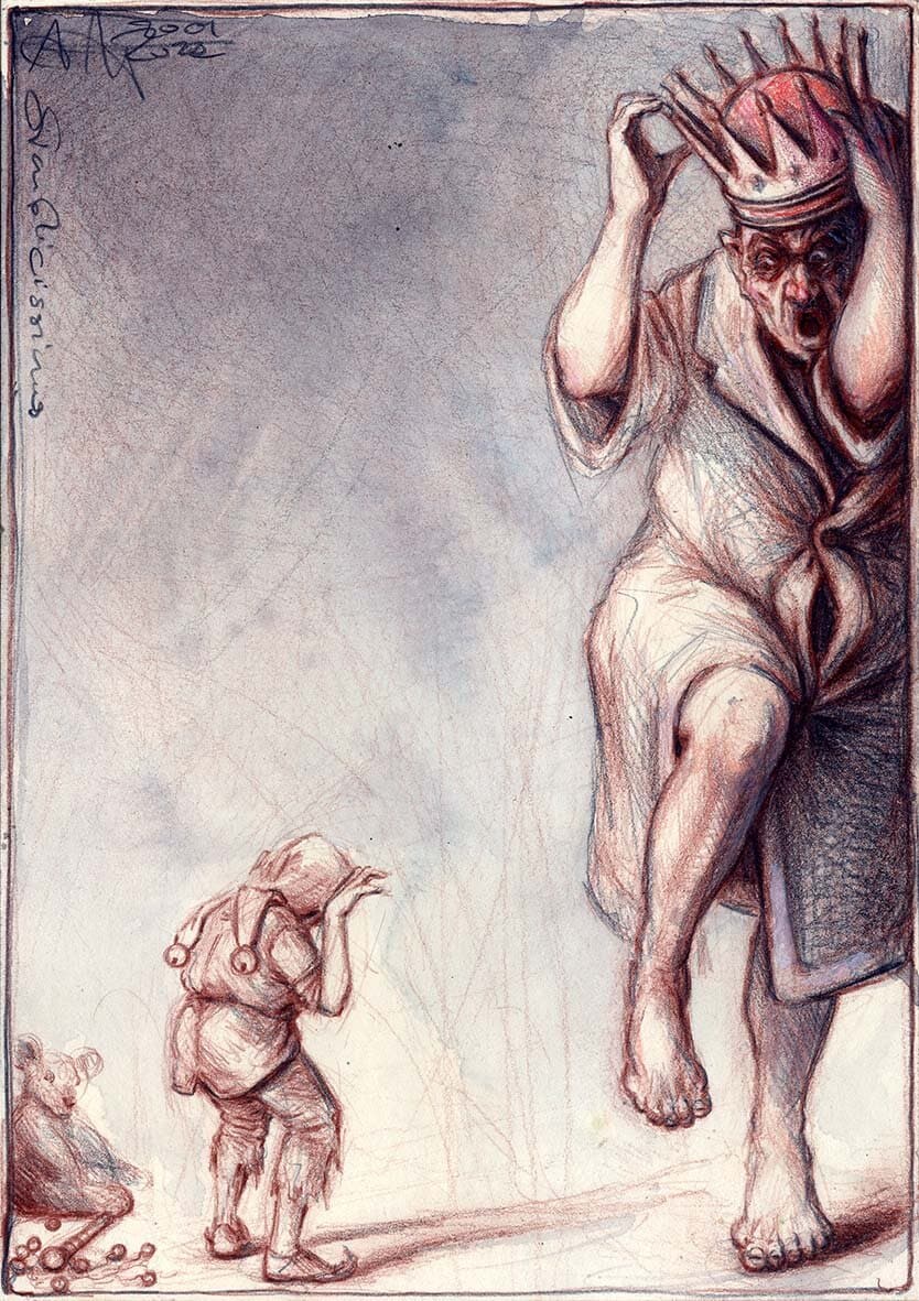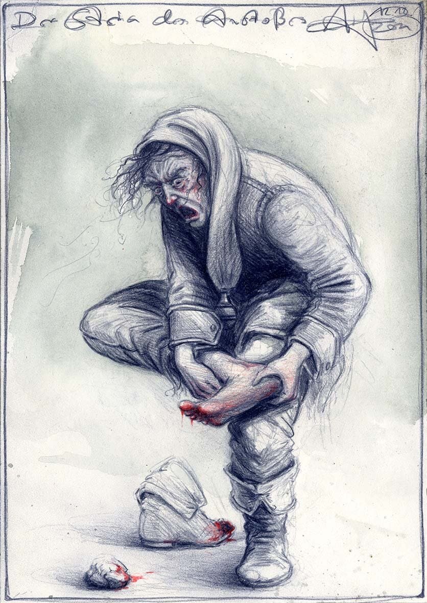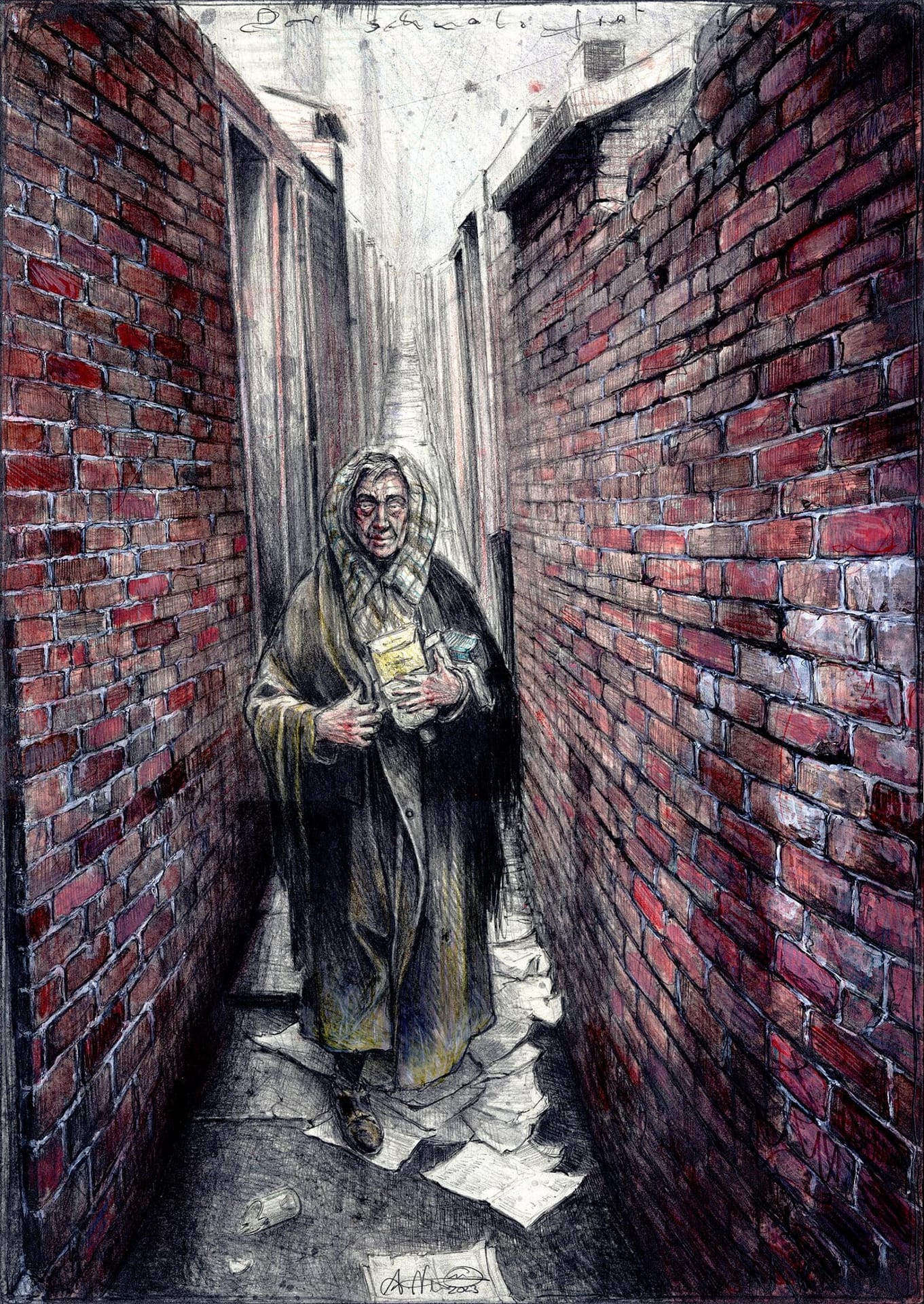 Kohle, Farbstift, Aquarell