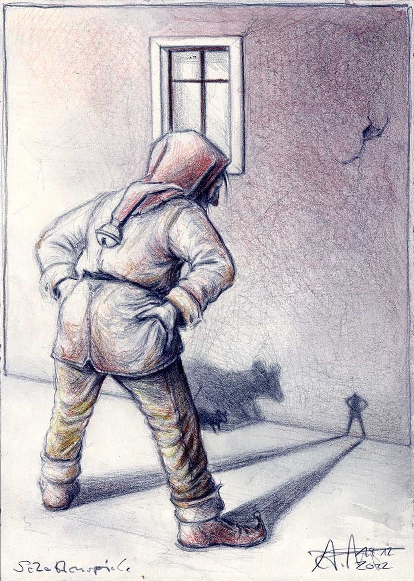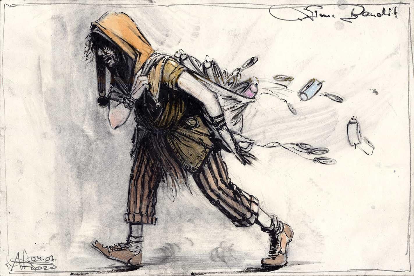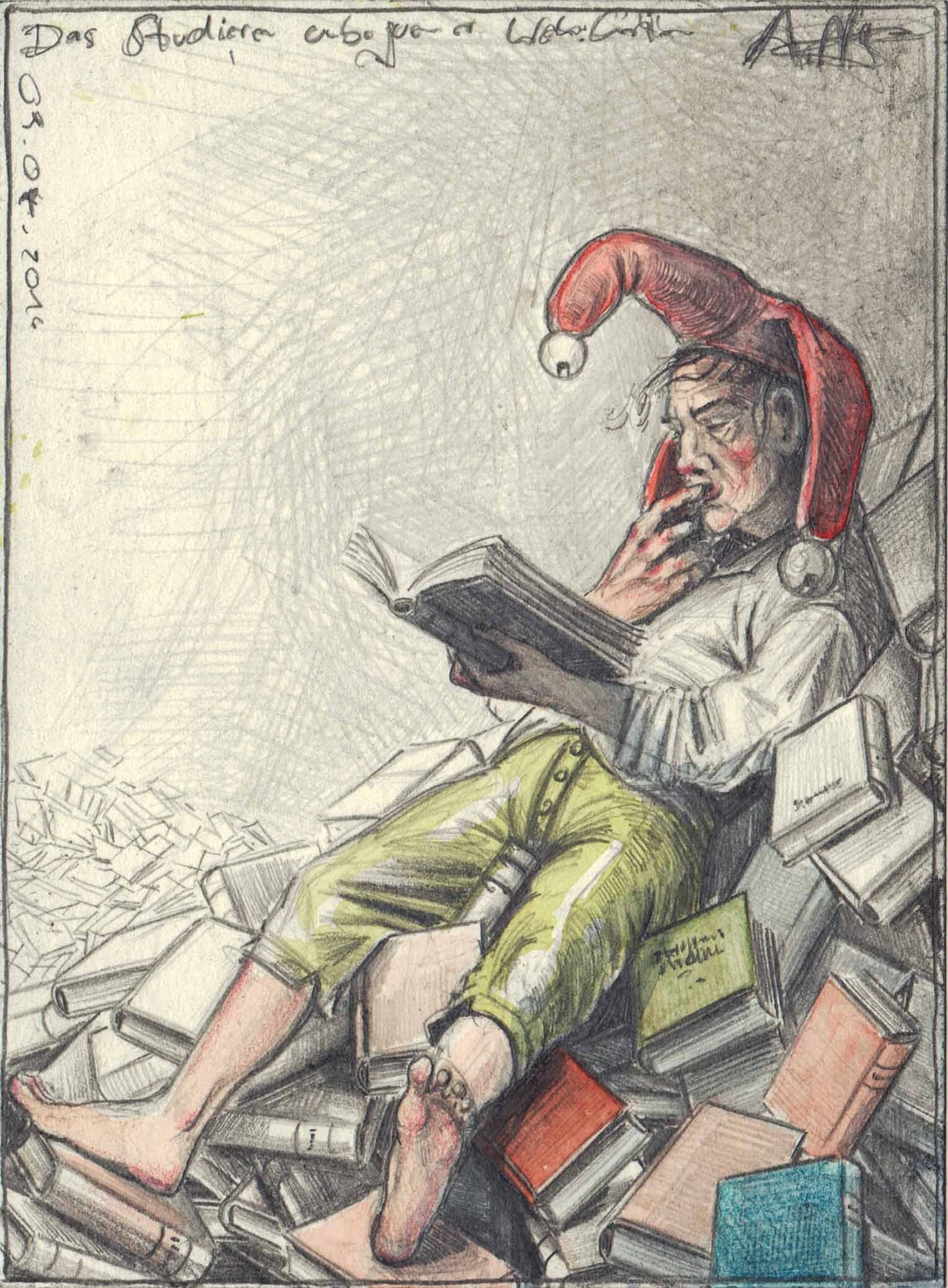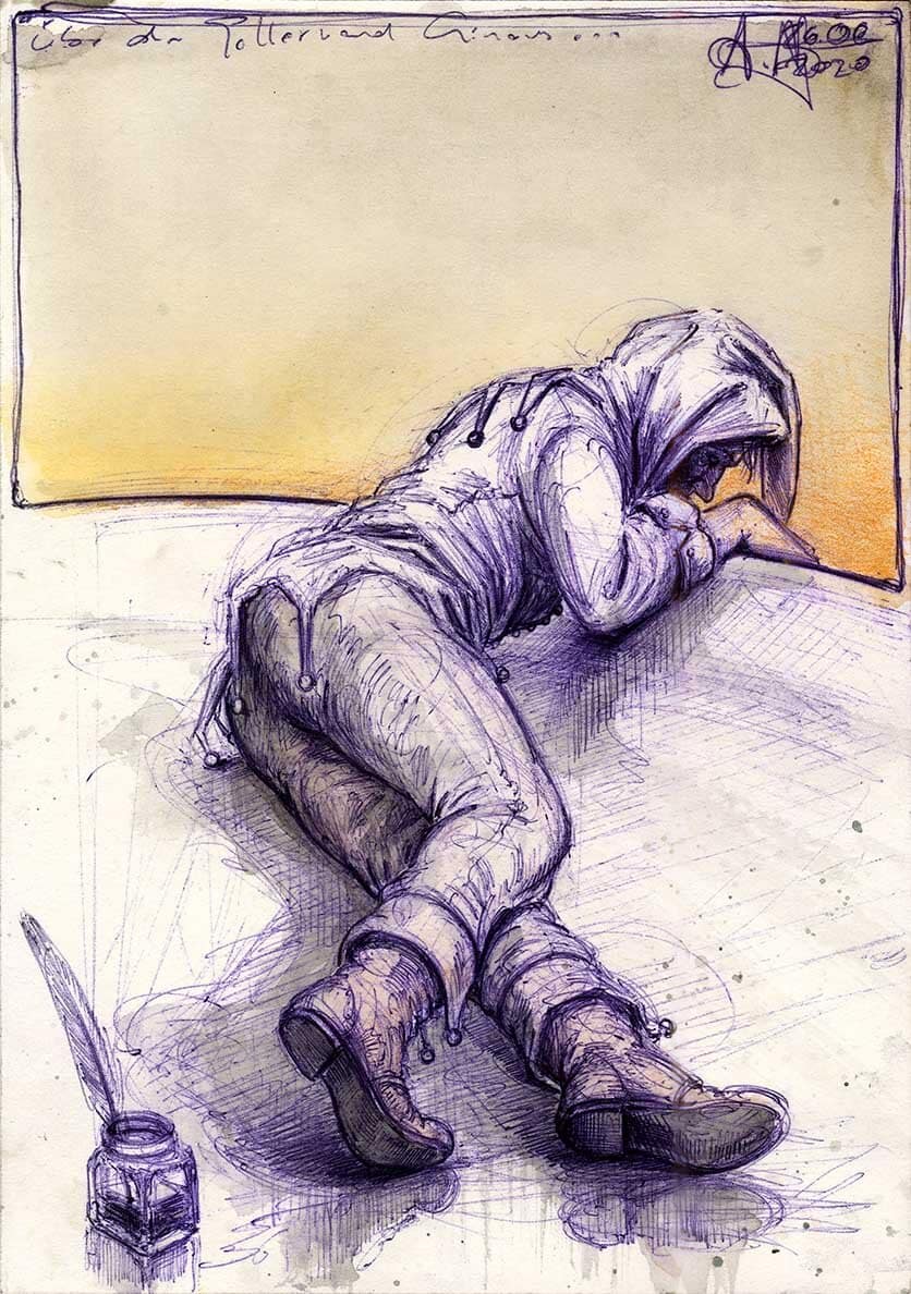 Kugelschreiber, Farbstift, Aquarell