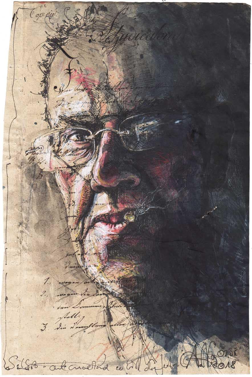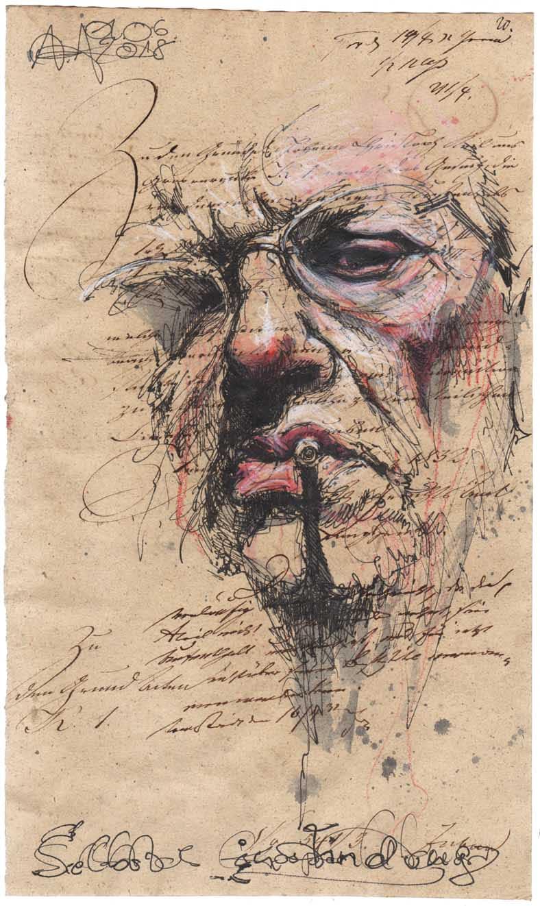 Federzeichnung, Farbstift, Aquarell, Tusche, Collage