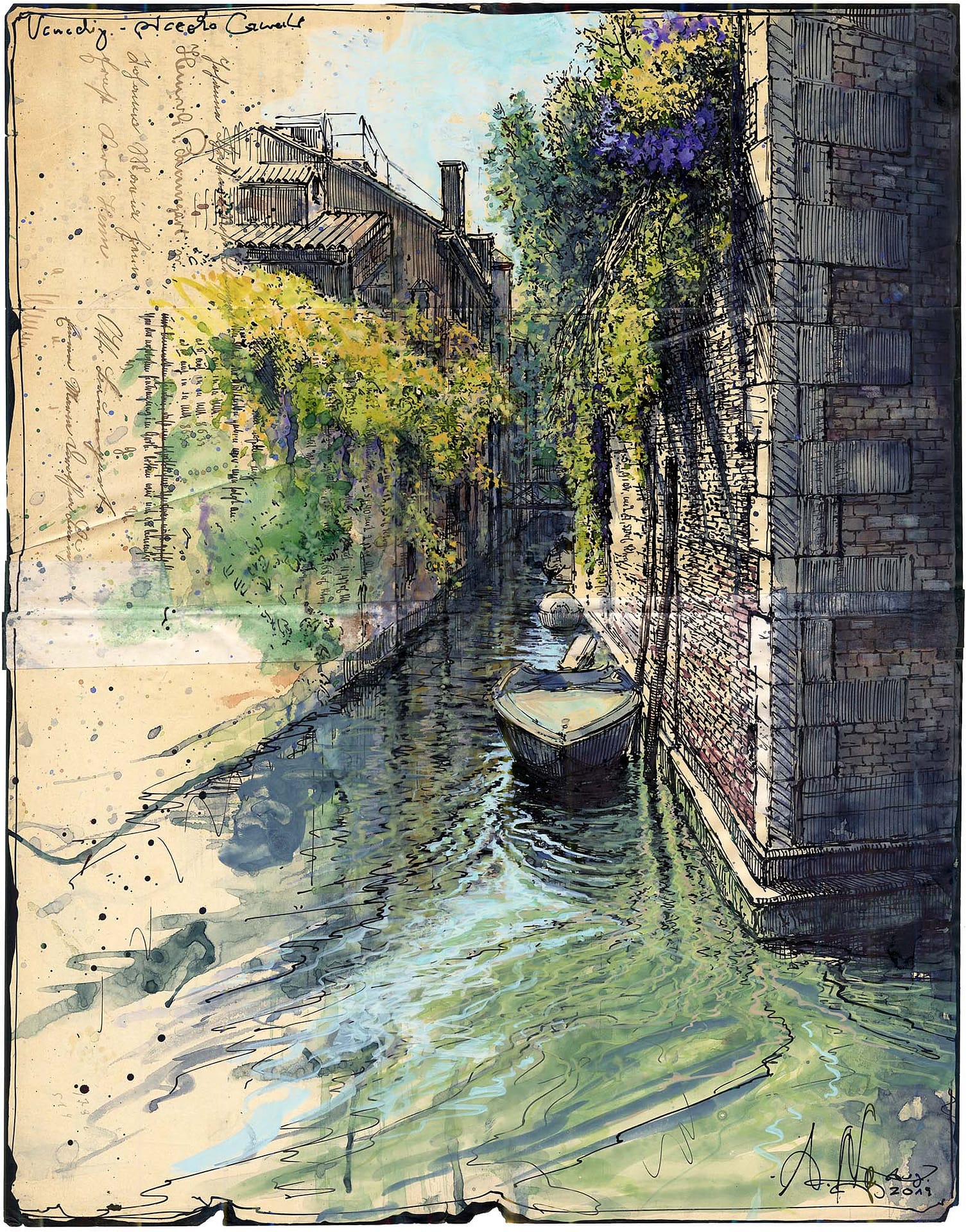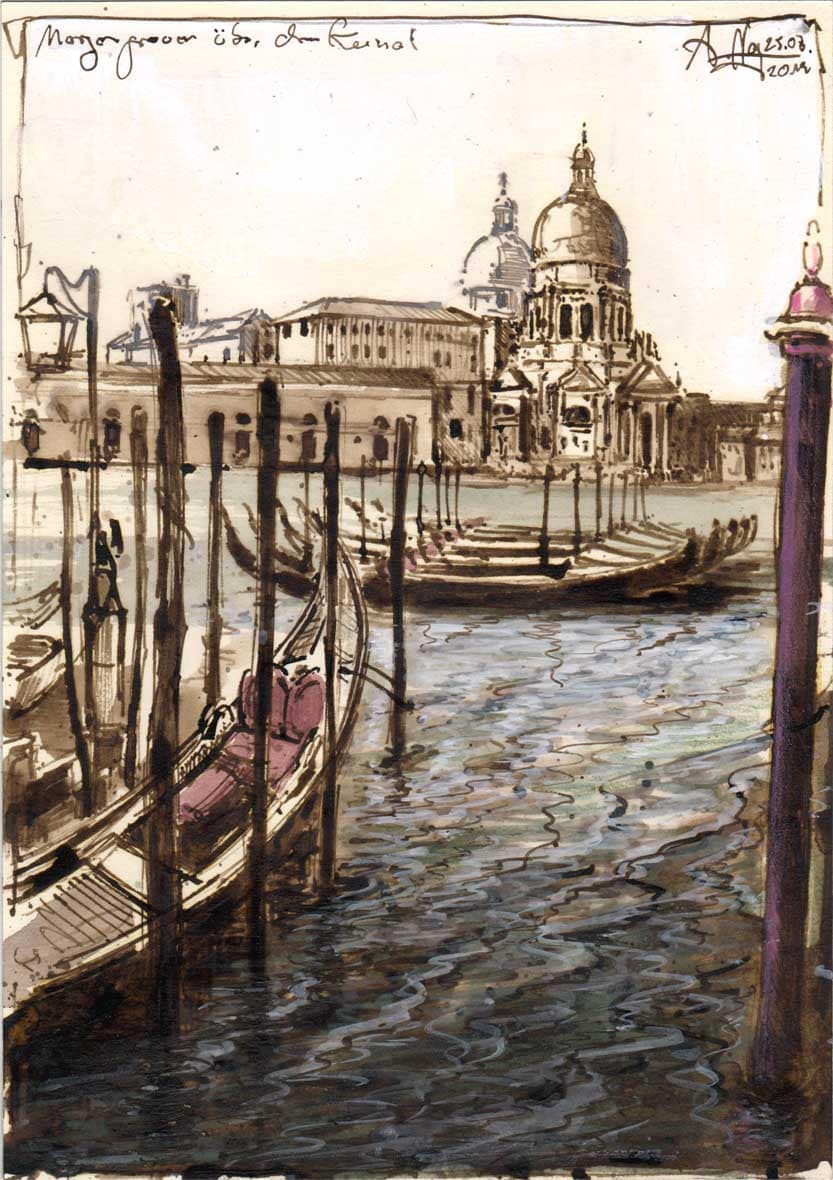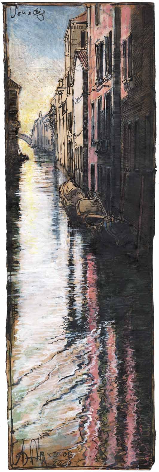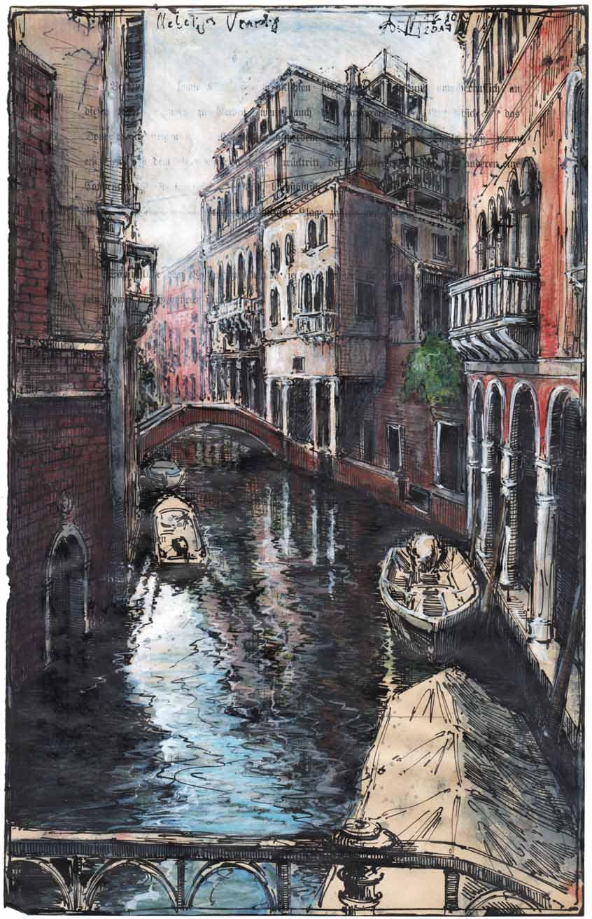 Rohrfederzeichnung, Sepia, Aquarell, Farbstift