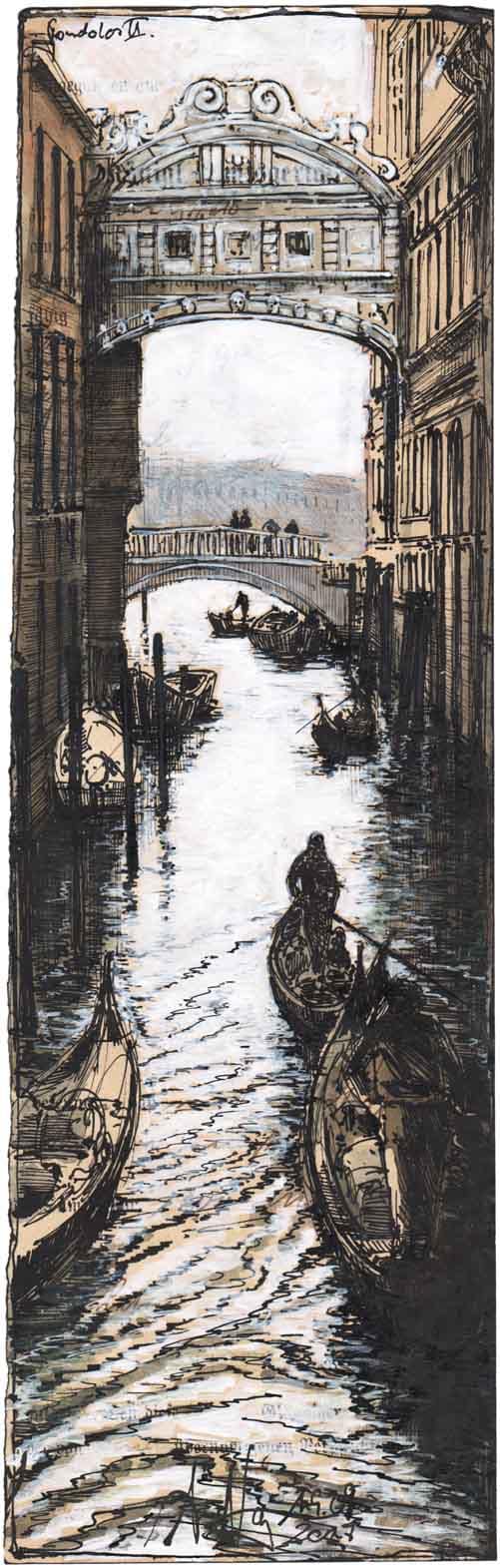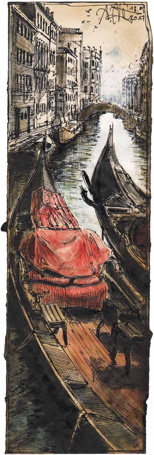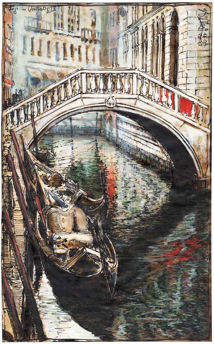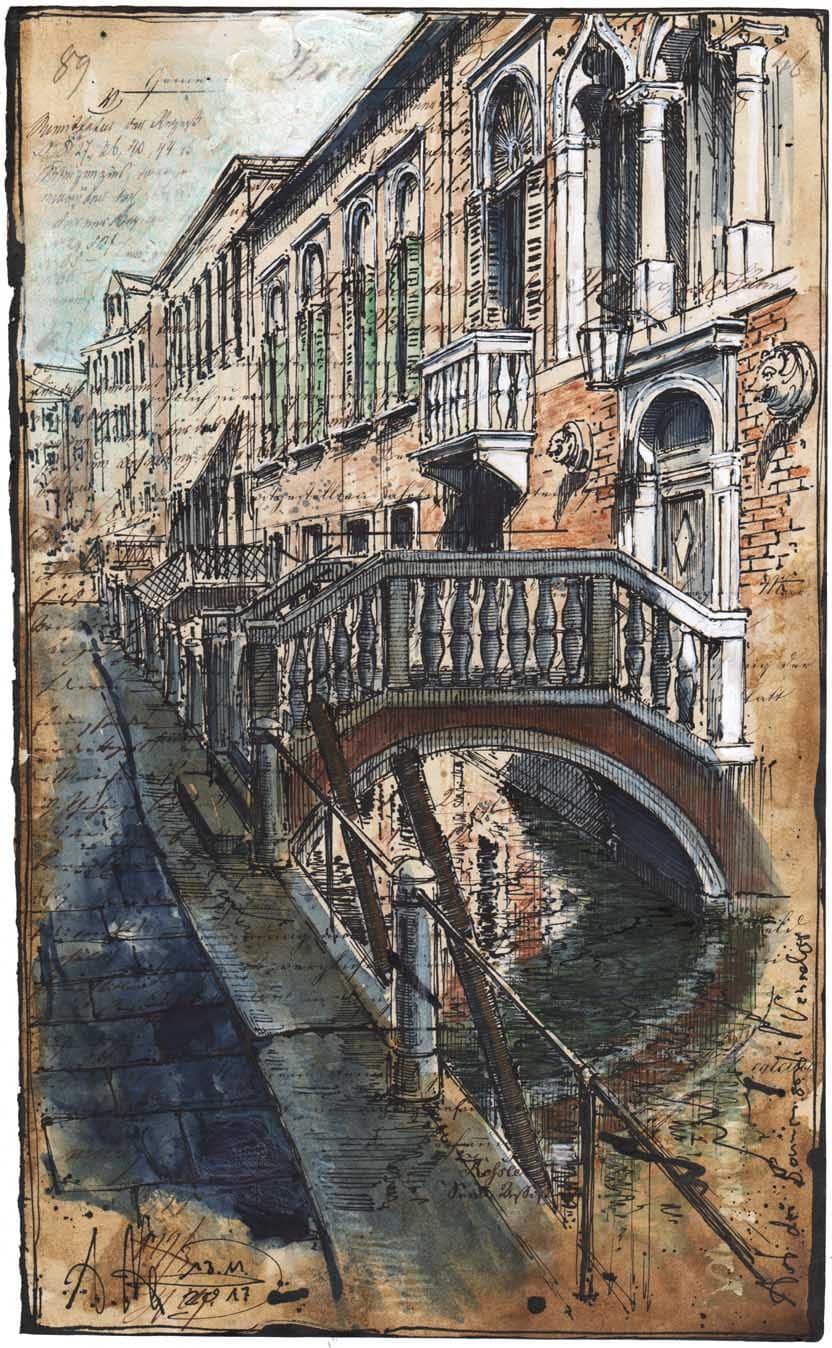 Rohrfederzeichnung, Sepia, Aquarell, Farbstift