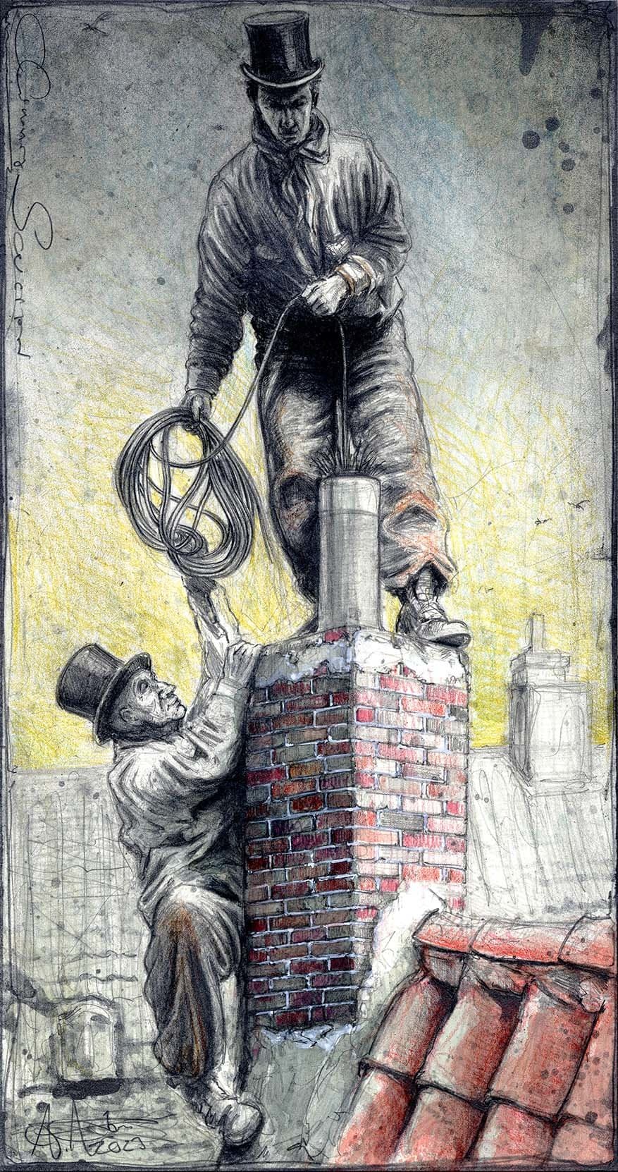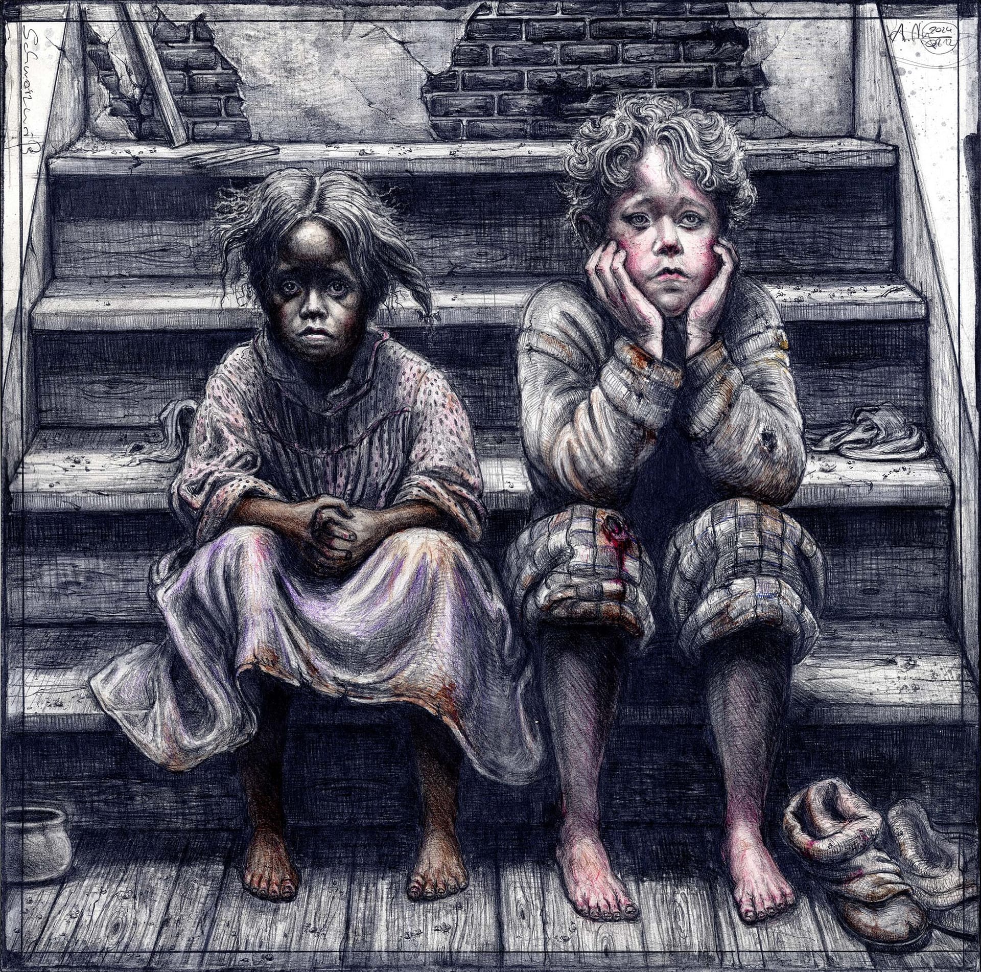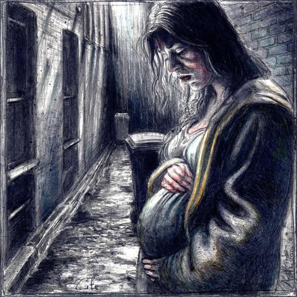 Federzeichnung, Farbstift, Aquarell