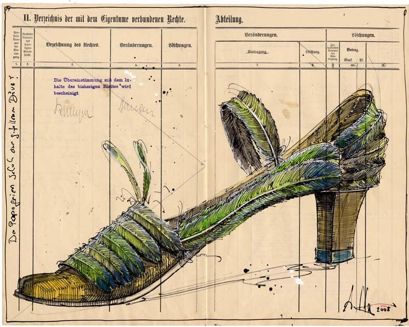 Der Papageienschuh einer gefallenen Diva1. August 2015 Federzeichnung, Farbstift, Aquarell, TuscheWvz. 4426Format: 330 x 420 mmOktober 2008 Vorheriger BeitragSauwohl-fühl DamenschuhNächster BeitragDie große Pfauschuhlette