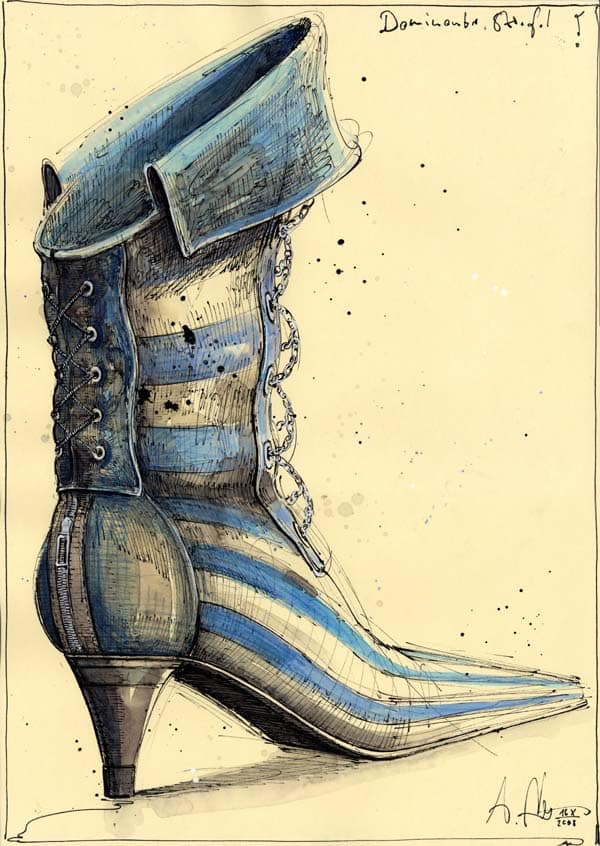 Dominanter Stiefel1. August 2015 Federzeichnung, Farbstift, Aquarell, TuscheWvz. 4428Format: 500 x 350 mmOktober 2008 Vorheriger BeitragDie große PfauschuhletteNächster BeitragSchwanenseegestöckel