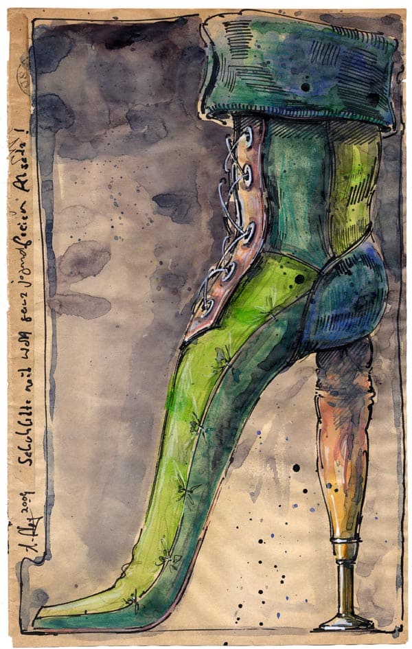 Schuhlette mit nicht ganz jugendfreiem Absatz24. Juli 2015 Federzeichnung, Farbstift, Aquarell, TuscheWvz. 4533Format: 332 x 208 mmAugust 2009 Vorheriger BeitragEin ganz bequemer StiefelNächster BeitragWeimar – Im Garten Goethes