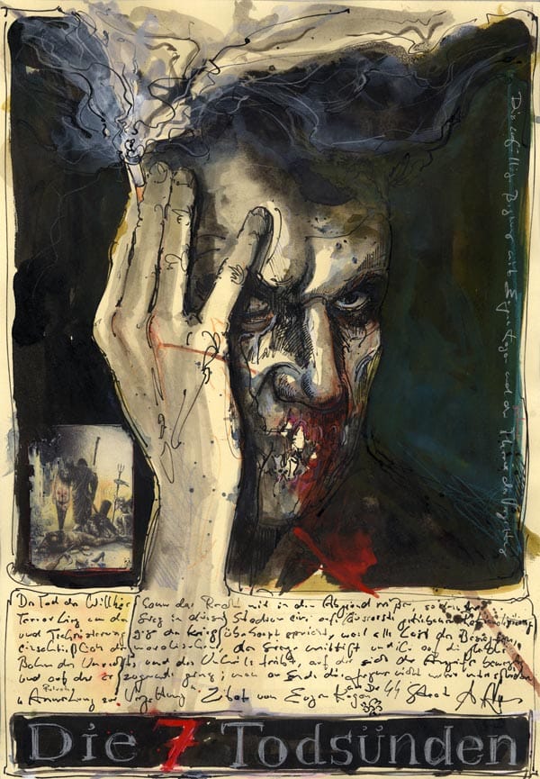 Anmerkung zur Vergeltung – zufällige Begegnung mit Eugen Kogon24. Juli 2015 Federzeichnung, Farbstift, Aquarell, Tusche, CollageWvz. 4542Format: 503x 349 mmSeptember 2009 Vorheriger BeitragGula – GefräßigkeitNächster BeitragAcedia- Trägheit