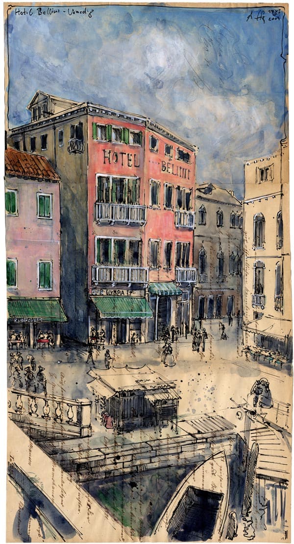 Hotel Bellini – Venedig24. Juli 2015 Federzeichnung, Farbstift, Aquarell, TuscheWvz. 4557Format: 626 x 329 mmNovember 2009 Vorheriger BeitragThornbushNächster BeitragSeitenkanal Ambiente – Venedig