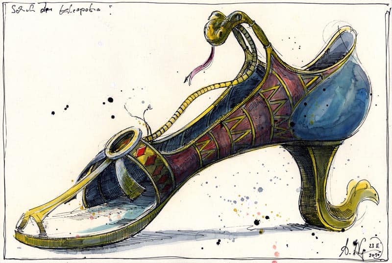 Schuh der Kleopatra19. Juli 2015 Federzeichnung, Farbstift, AquarellWvz. 4588Format: 310 x 462 mmFebruar 2010 Vorheriger BeitragSchuh einer charmanten HausfrauNächster BeitragHexenzank (n. Goyas Capricho „Wer würde das glauben“)