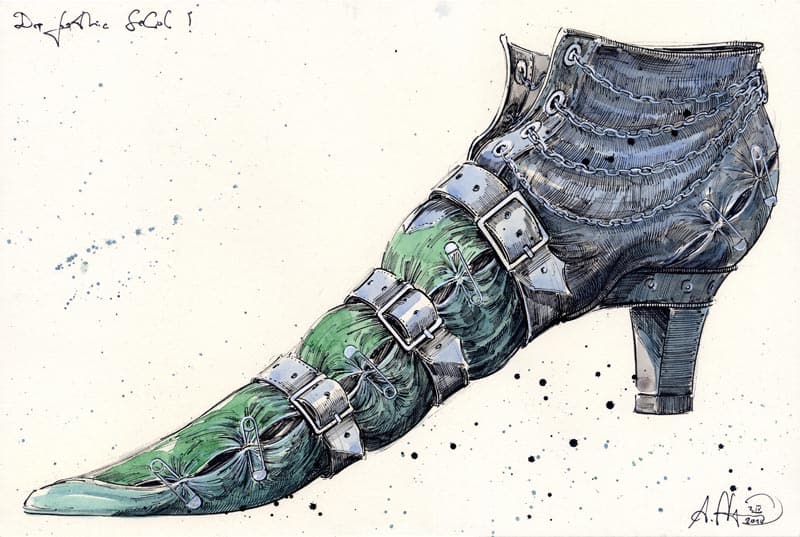 Der Gothic Schuh19. Juli 2015 Federzeichnung, Farbstift, Aquarell, TuscheWvz. 4596Format: 324 x 484 mmApril 2010 Vorheriger BeitragSchuhlette einer alternden BibliothekarinNächster BeitragFlower Power, ein 68er Flip Flop