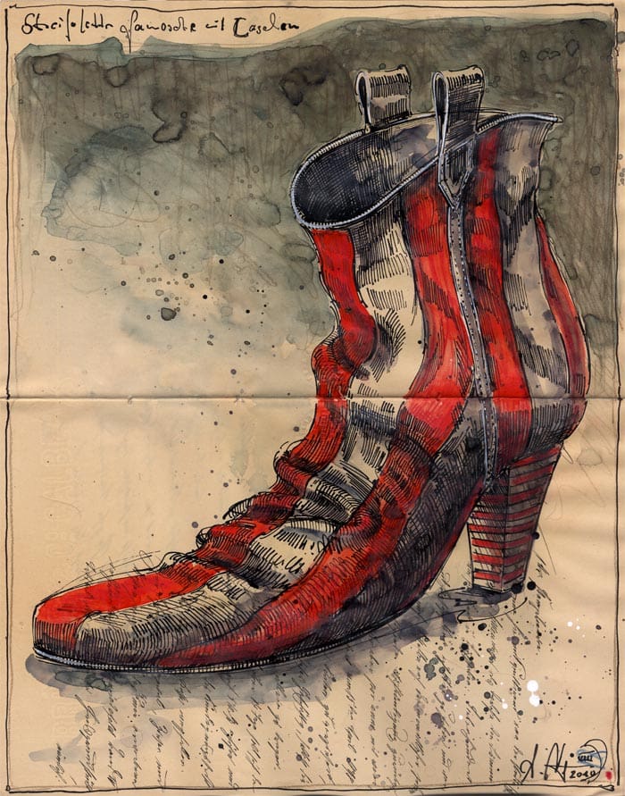 Federzeichnung, Farbstift, Aquarell, Tusche