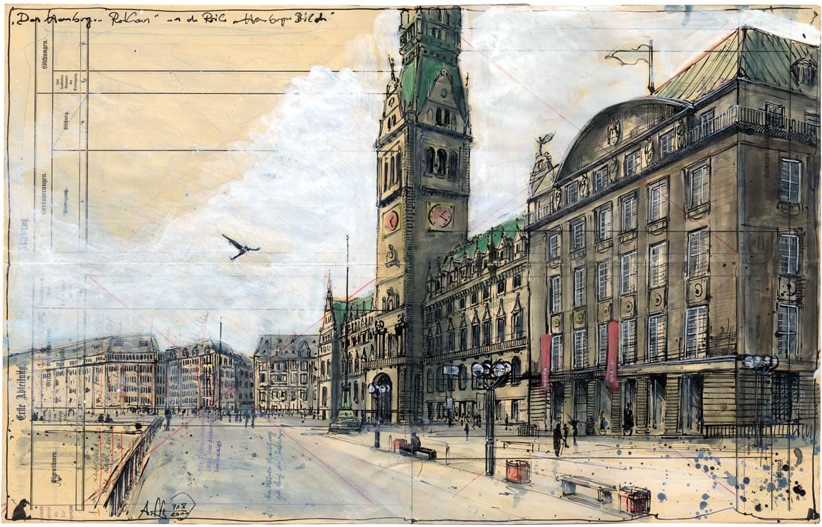 Das Hamburger Rathaus19. Juli 2015 Federzeichnung, Farbstift, Aquarell, Tusche, Pastell, CollageWvz. 4712Format: 422 x 662 mmMai 2011 Vorheriger BeitragIra – Hass oder eine Art Hamburger HillNächster BeitragAlster Arkaden