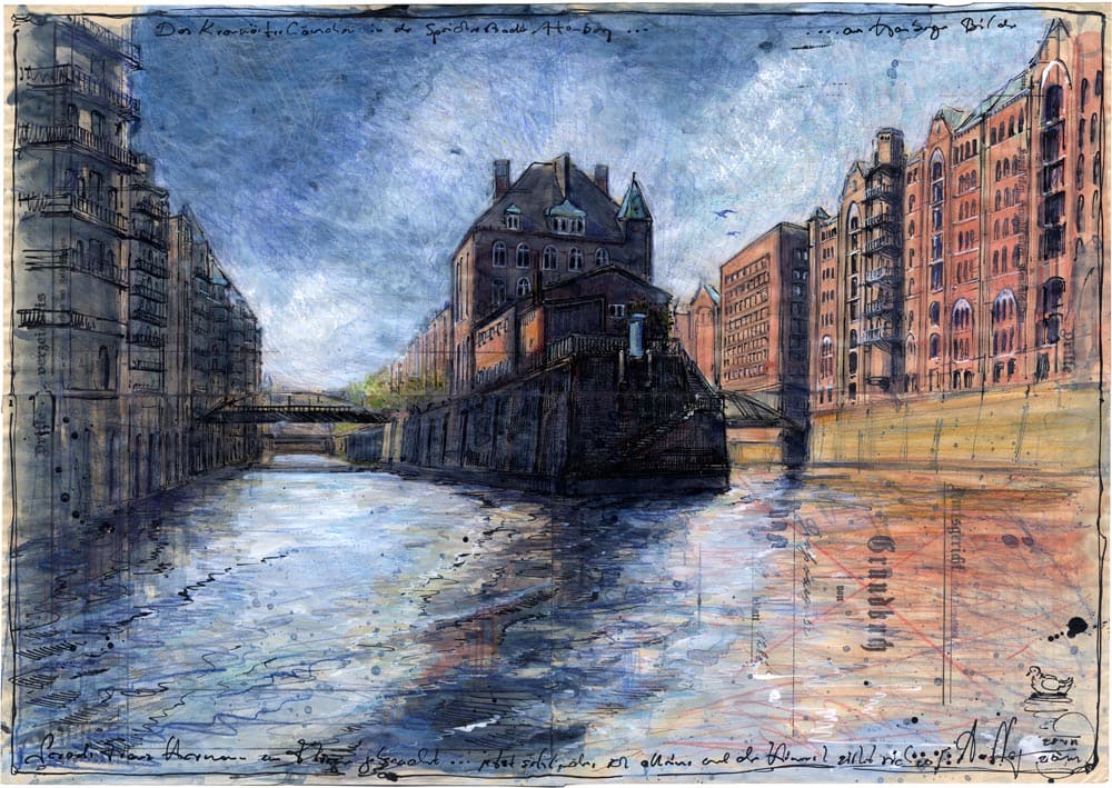 Das Kranwärterhäuschen in der Speicherstadt Hamburg19. Juli 2015 Federzeichnung, Farbstift, Aquarell, Tusche, Pastell, CollageWvz. 4728Format: 418 x 599 mmJuli 2011 Vorheriger BeitragDie große TorheitNächster BeitragDie Fahrt über die Binnenalster Richtung Jungfernsteg
