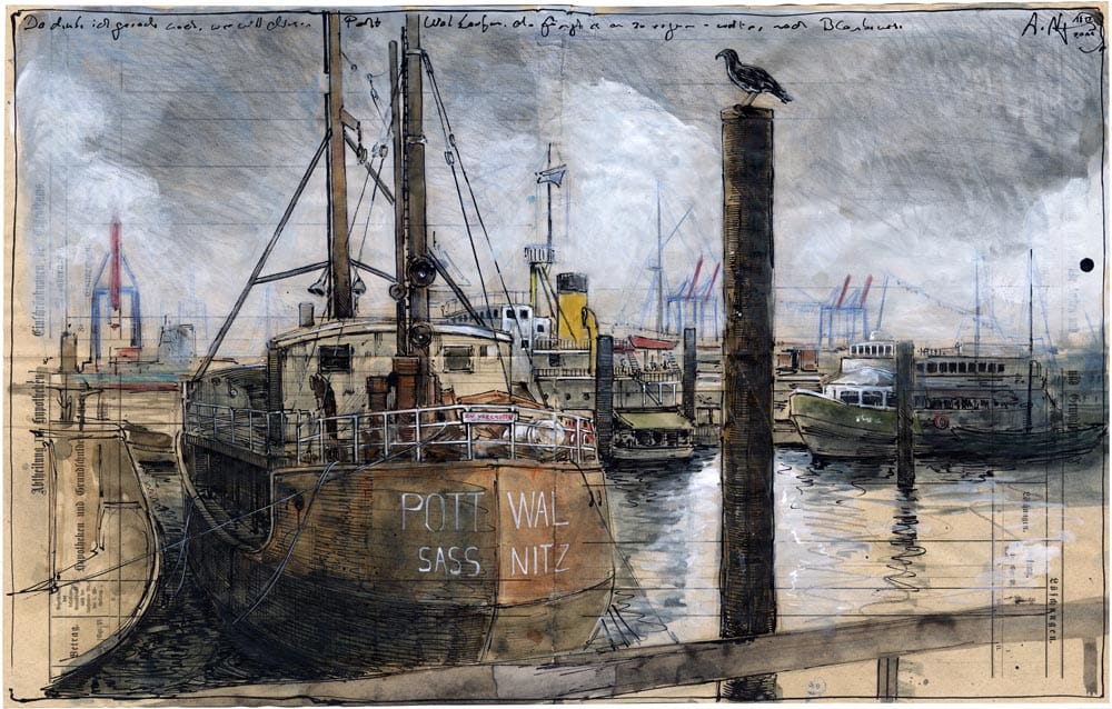 Da denke ich gerade noch, wer will diesen Pott Wal kaufen, da fängt es an zu regnen … weiter nach Blankenese19. Juli 2015 Federzeichnung, Farbstift, Aquarell, Tusche, CollageWvz. 4739Format: 428 x 677 mmSeptember 2011 Vorheriger BeitragAuch da nur kurz dran vorbei, per S-Bahn, dem Feuerschiff HamburgNächster BeitragÜber den Dächern von Hamburg – St. Georg Hotel