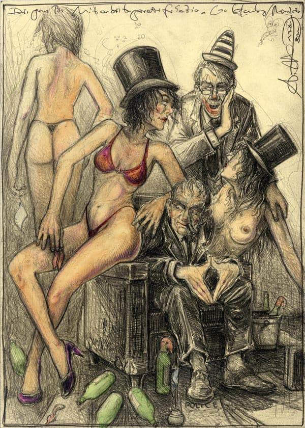Die große Mitarbeiter Gratifikation (zu Hamburg und Mannheim)19. Juli 2015 Bleistift , Farbstift, AquarellWvz. 4744Format: 350 x 250 mmOktober 2011 Vorheriger BeitragFrisch von der StangeNächster BeitragIm Tingel Tangel