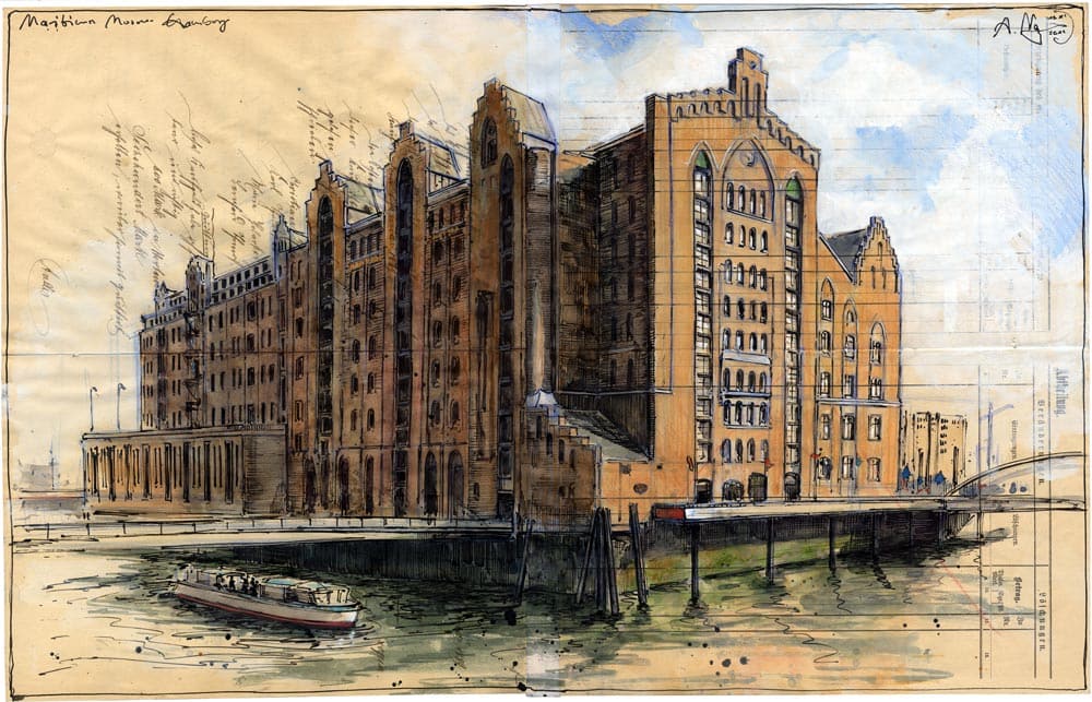 Maritimes Museum Hamburg19. Juli 2015 Federzeichnung, Farbstift, Aquarell, Tusche, CollageWvz. 4750Format: 417 x 658 mmNovember 2011 Vorheriger BeitragLandungsbrücken – König der LöwenNächster BeitragDeichstrasse Hamburg