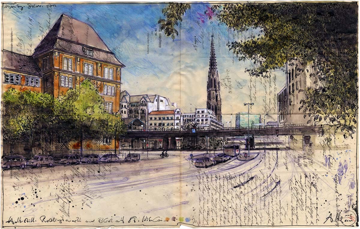 Haltestelle Rodingsmarkt und Blick auf St. Nikolai19. Juli 2015 Federzeichnung, Farbstift, Aquarell, Tusche, Pastell, CollageWvz. 4786Format: 419 x 662 mmFebruar 2012 Vorheriger BeitragFleetschlösschen HamburgNächster BeitragDeutsches Schauspielhaus – Hamburg