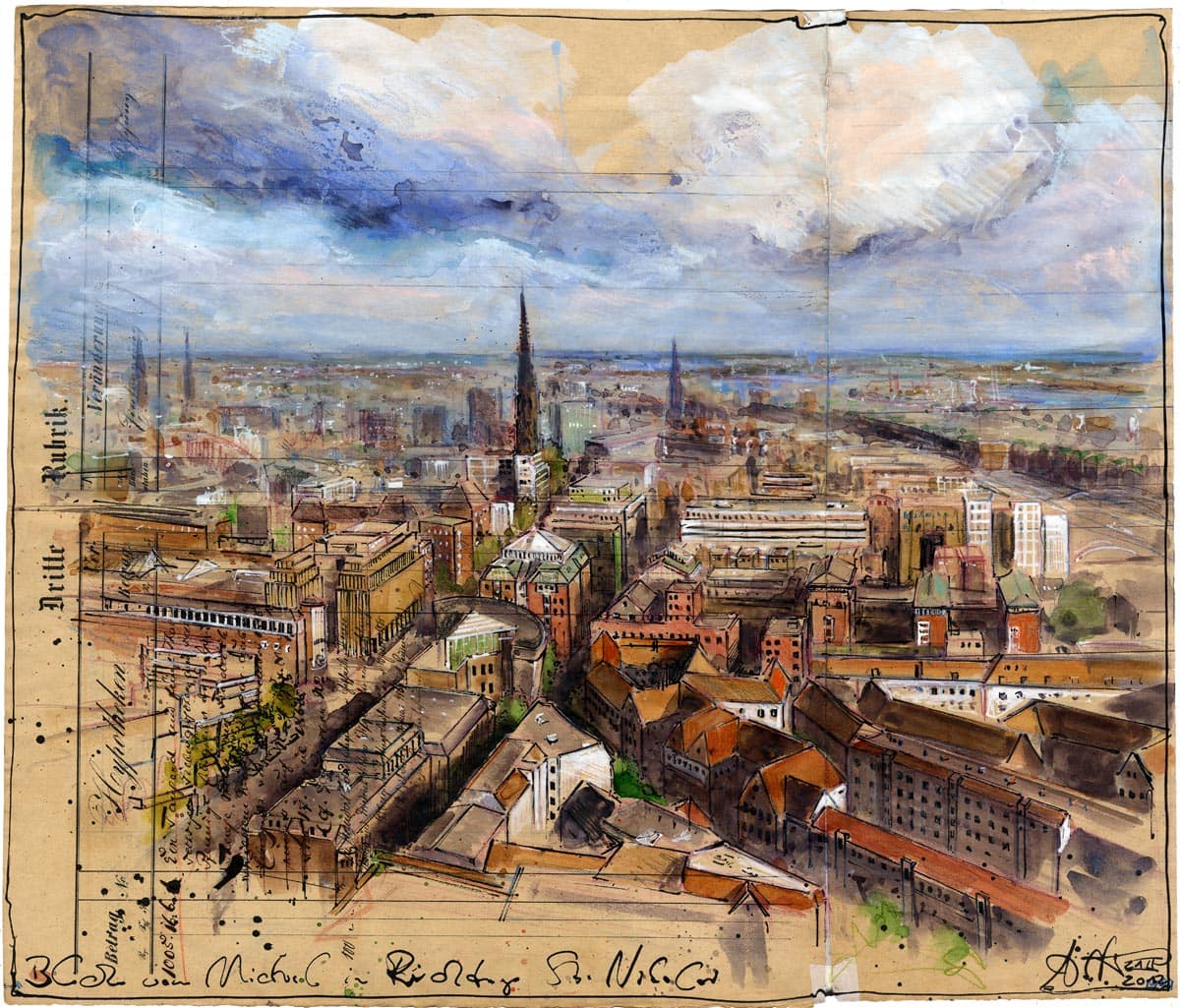Blick vom Michel in Richtung St. Nikolai19. Juli 2015 Federzeichnung, Farbstift, Aquarell, Tusche, CollageWvz. 4788Format: 428 x 492 mmFebruar 2012 Vorheriger BeitragDeutsches Schauspielhaus – HamburgNächster BeitragAuch so erkennt er sie nicht (frei n. Goyas Capricho No. 7)