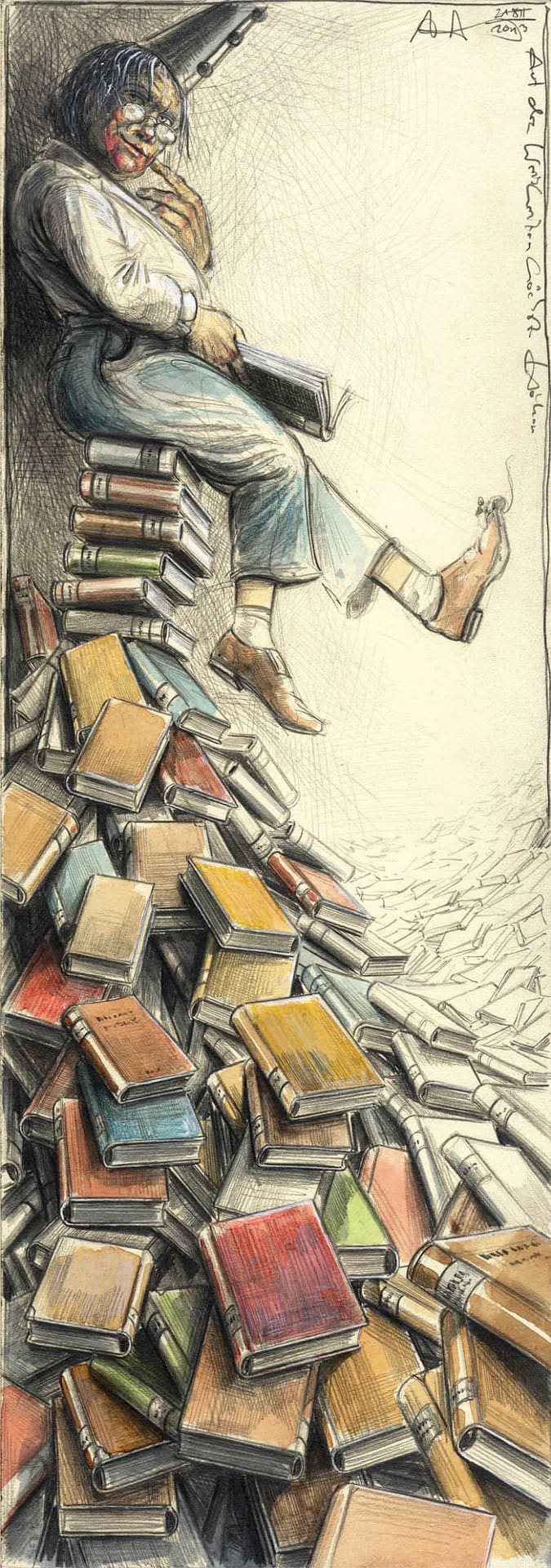 Auf den Weisheiten höchster Höhen18. Juli 2015 Bleistift, Farbstift, Aquarell, weiße TuscheWvz. 4931Format: 500 x 175 mmDezember 2013 Vorheriger BeitragDer QuerflötenspielerNächster BeitragDas dicke Köchlein und sein Kochbuch